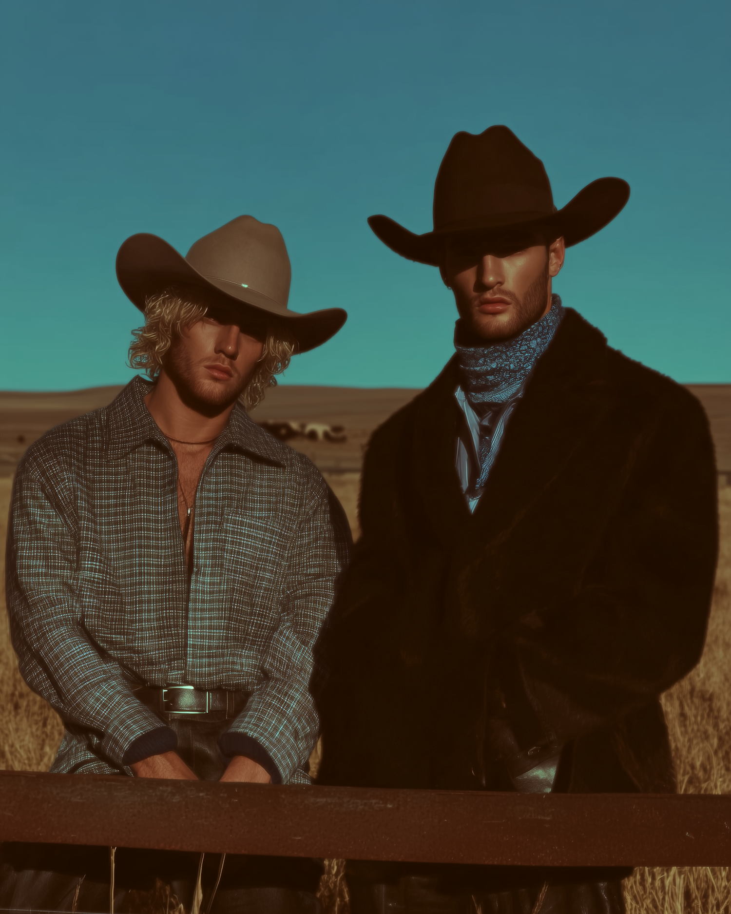 Two individuals in cowboy hats and rustic attire stand by a fence in a rural field under a clear blue sky.