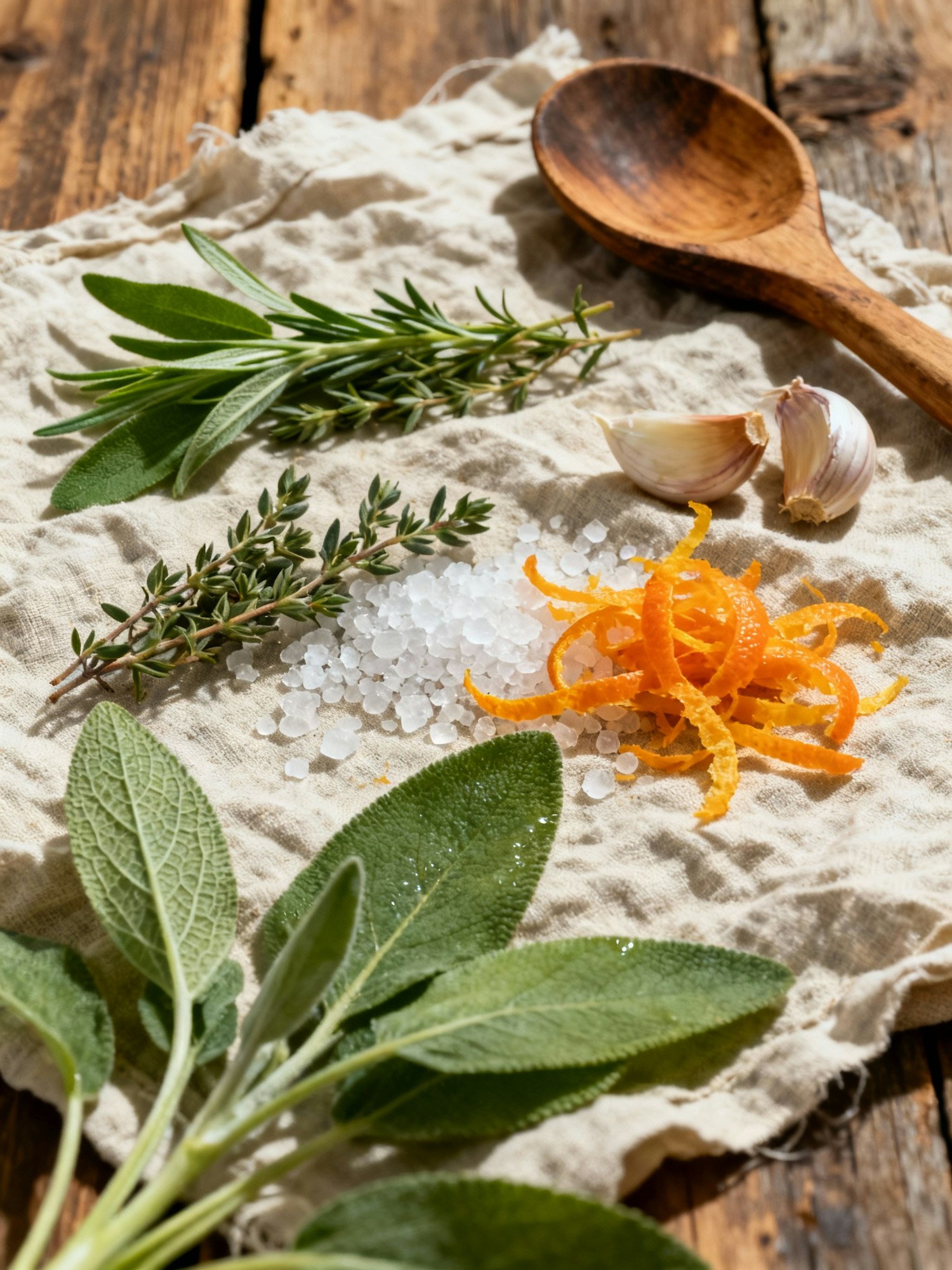 Fresh herbs, garlic, sea salt, and orange zest on a rustic cloth with a wooden spoon, perfect for a natural cooking vibe.