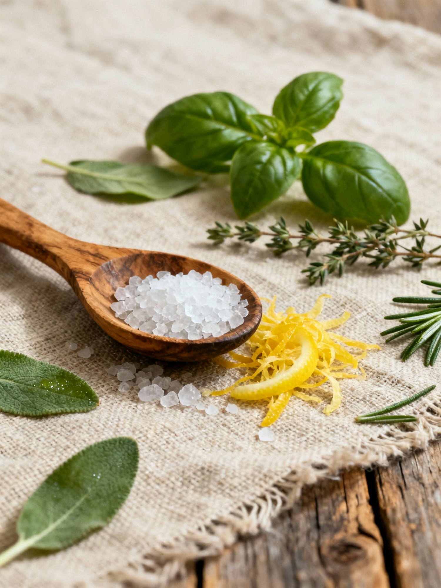 Ultra-real food photograph of fresh basil, thyme, and rosemary scattered on crumpled natural linen with coarse sea salt and lemon zest; rustic olive-wood spoon on the side. Medium-format studio (150MP) tethered capture; 85 mm at f/4; daylight-balanced 5600 K key through 4×6' diffuser, large white fill, black flags for shape; polarizer to tame glare; ISO 100. Angle: 45° three-quarter. Color: natural, restrained saturation. Surface: raw linen on reclaimed oak. Texture priority: crisp herbs, visible leaf veins. Negative: fake plastic shine, oily highlights, heavy HDR, over-sharpen, color cast, logos, watermarks.