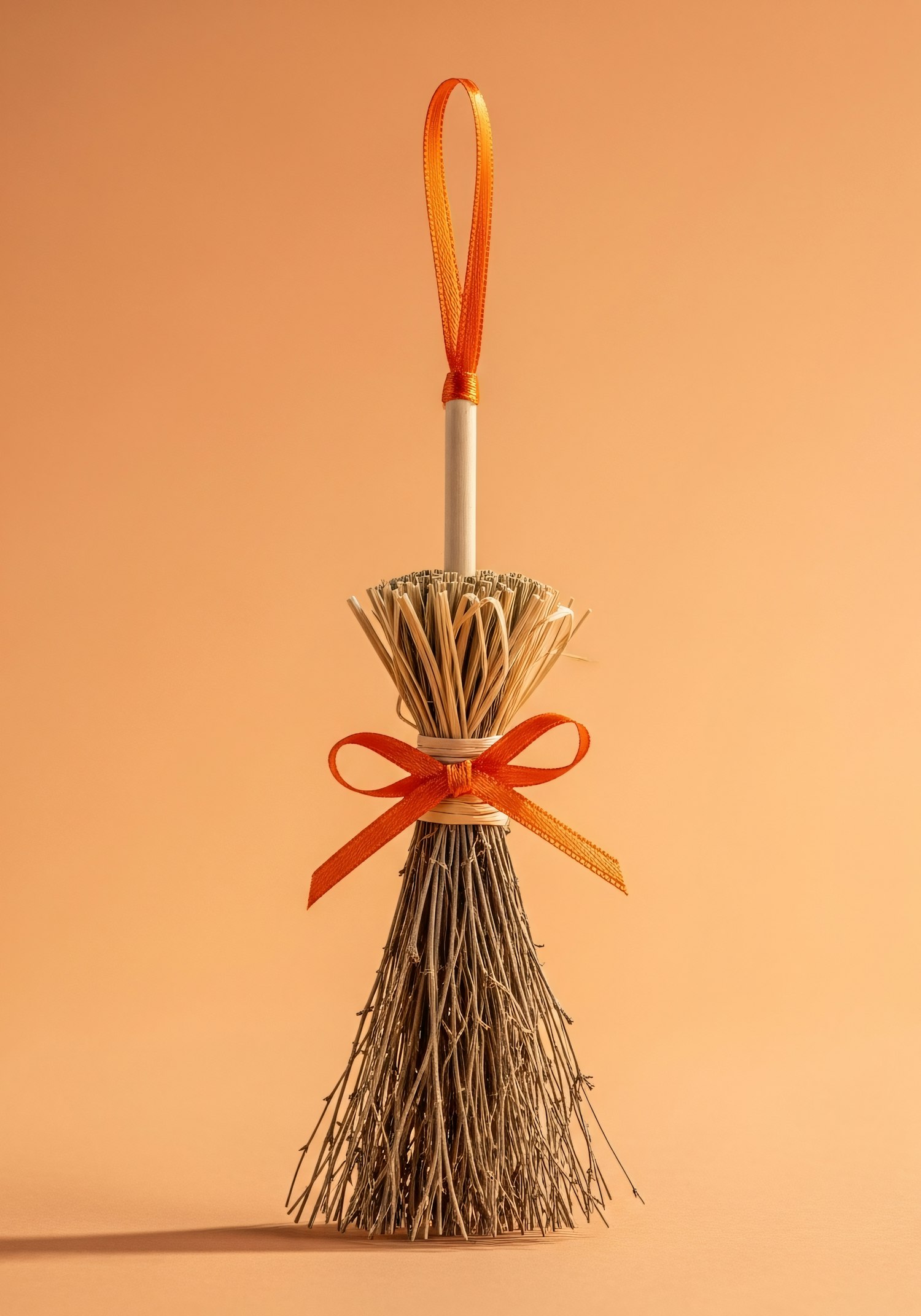 A decorative broom with orange ribbon and loop, crafted from natural twigs and straw, set against a warm orange background.