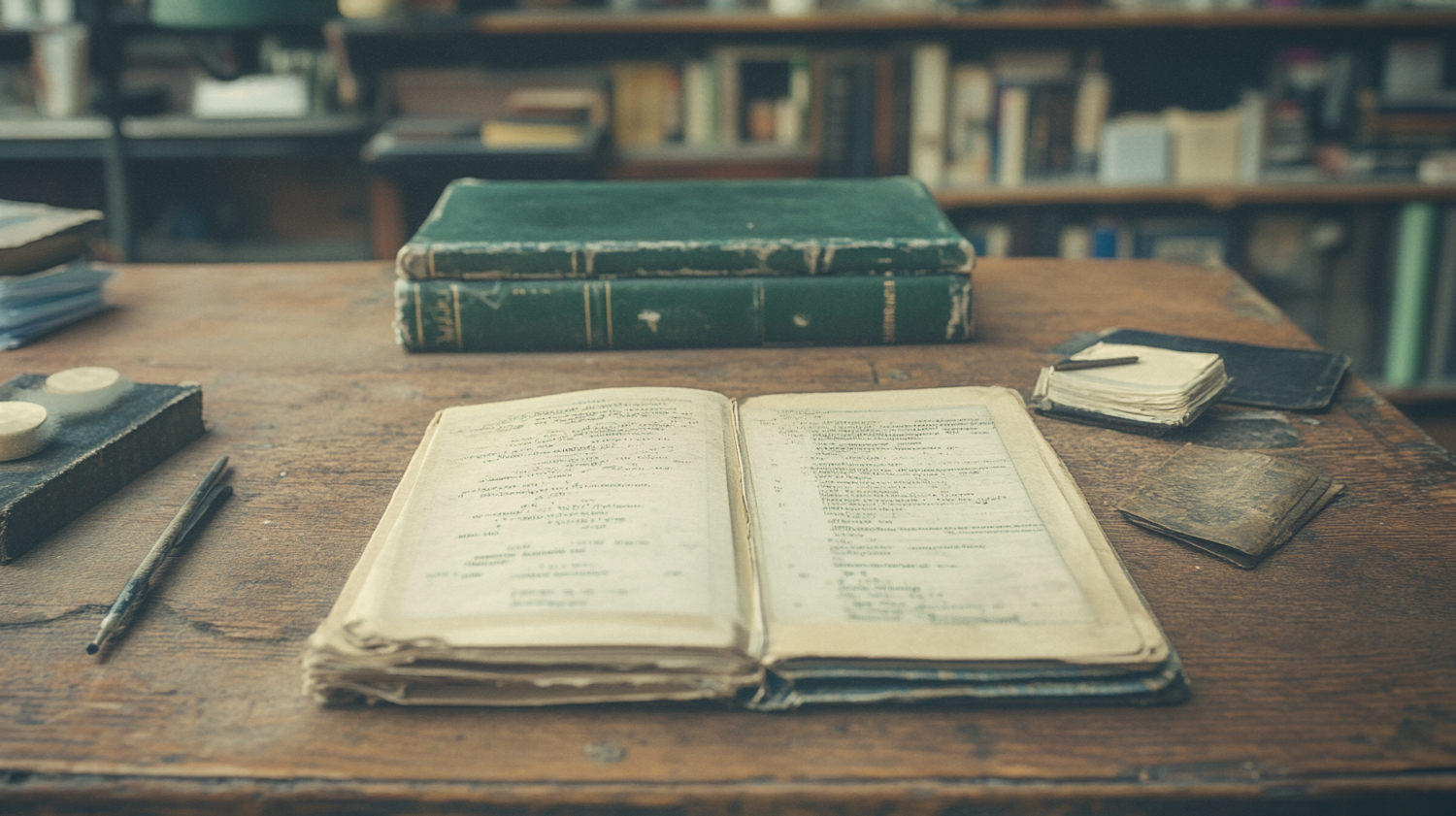 Vintage study scene with an open book, notebooks, and a pen on a wooden table, set against a blurred bookshelf background.