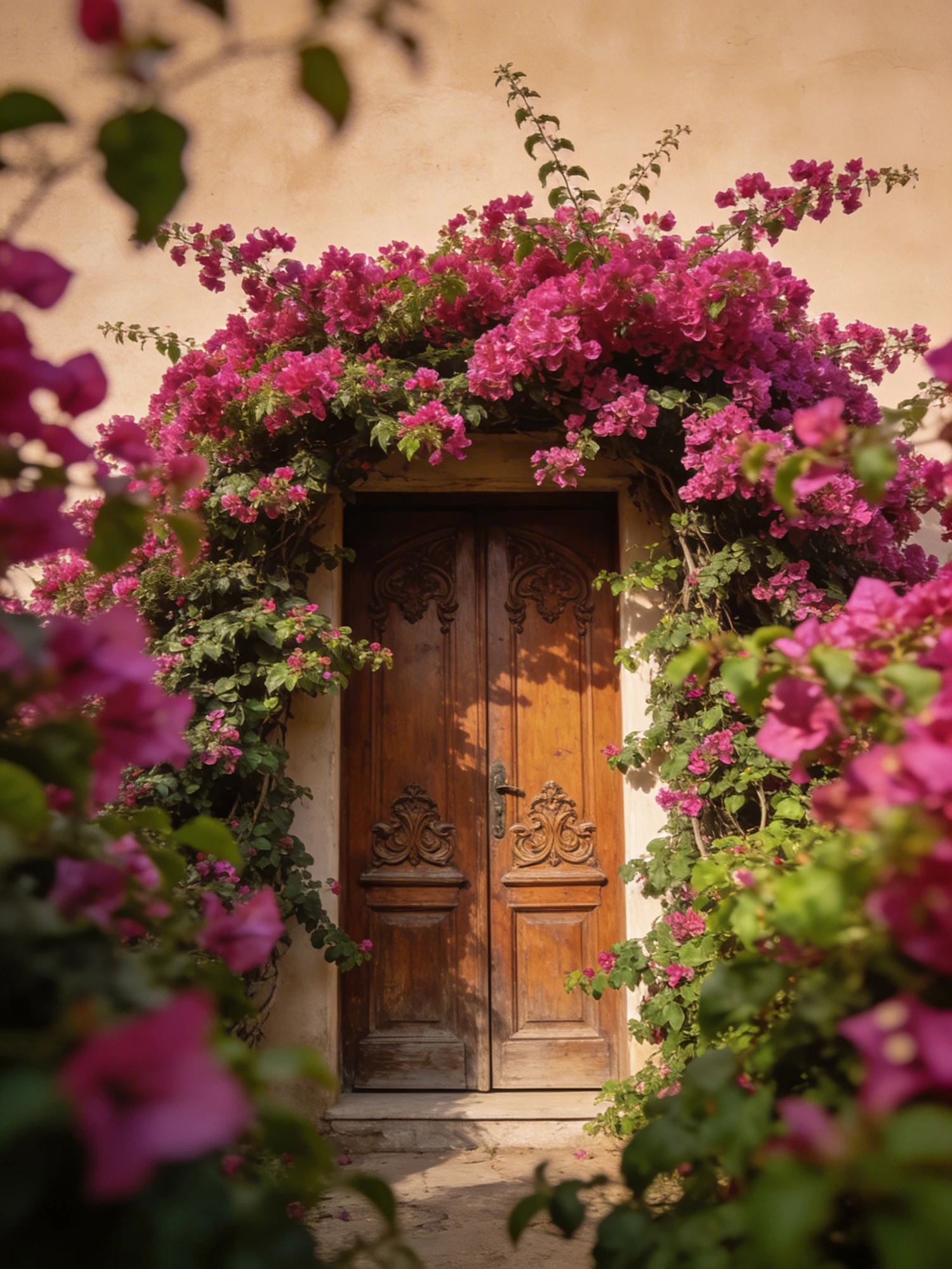 A vintage wooden door framed by thick bougainvillea vines, warm taupe background, soft lighting, centered composition, no text.