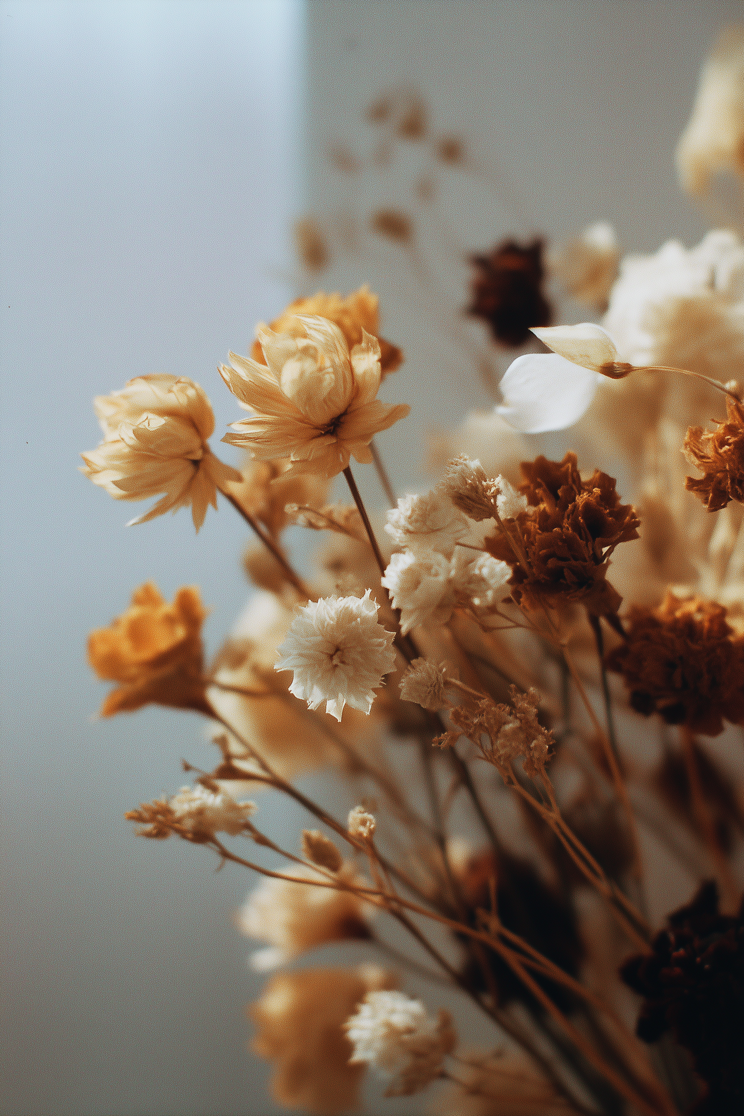 A close-up of dried flowers in warm tones of white, yellow, and brown, set against a softly blurred background for a rustic aesthetic.