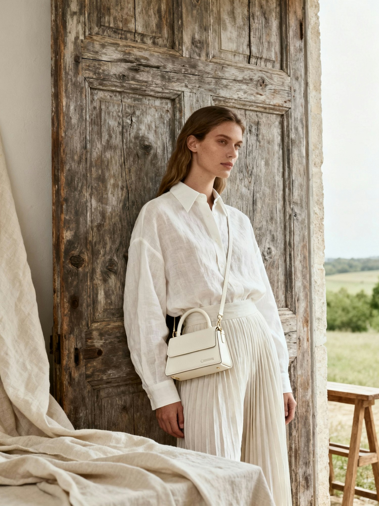 A refined rural setting inspired by the French countryside. Soft daylight, muted earthy tones, linen fabrics, wooden textures, and natural minimalism. The atmosphere feels calm, tactile, and contemporary — blending rustic authenticity with quiet elegance. Inspired by Jacquemus campaigns — refined simplicity, sculptural styling, and poetic tension between raw and delicate. A model standing in front of a large wooden door with visible texture, wearing a monochrome ivory look — oversized shirt tucked into pleated pants. Her Jacquemus Le Chiquito hangs from her shoulder, subtle contrast between sleek tailoring and rustic backdrop.