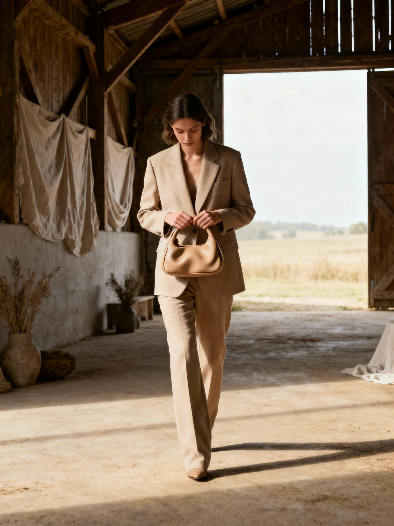 A refined rural setting inspired by the French countryside. Soft daylight, muted earthy tones, linen fabrics, wooden textures, and natural minimalism. The atmosphere feels calm, tactile, and contemporary — blending rustic authenticity with quiet elegance. Inspired by Jacquemus campaigns — refined simplicity, sculptural styling, and poetic tension between raw and delicate. A woman wearing a beige suit walks through a barn interior, carrying a Jacquemus bag with a firm yet elegant grip. Her gaze downward, fabric textures visible, background softly blurred.