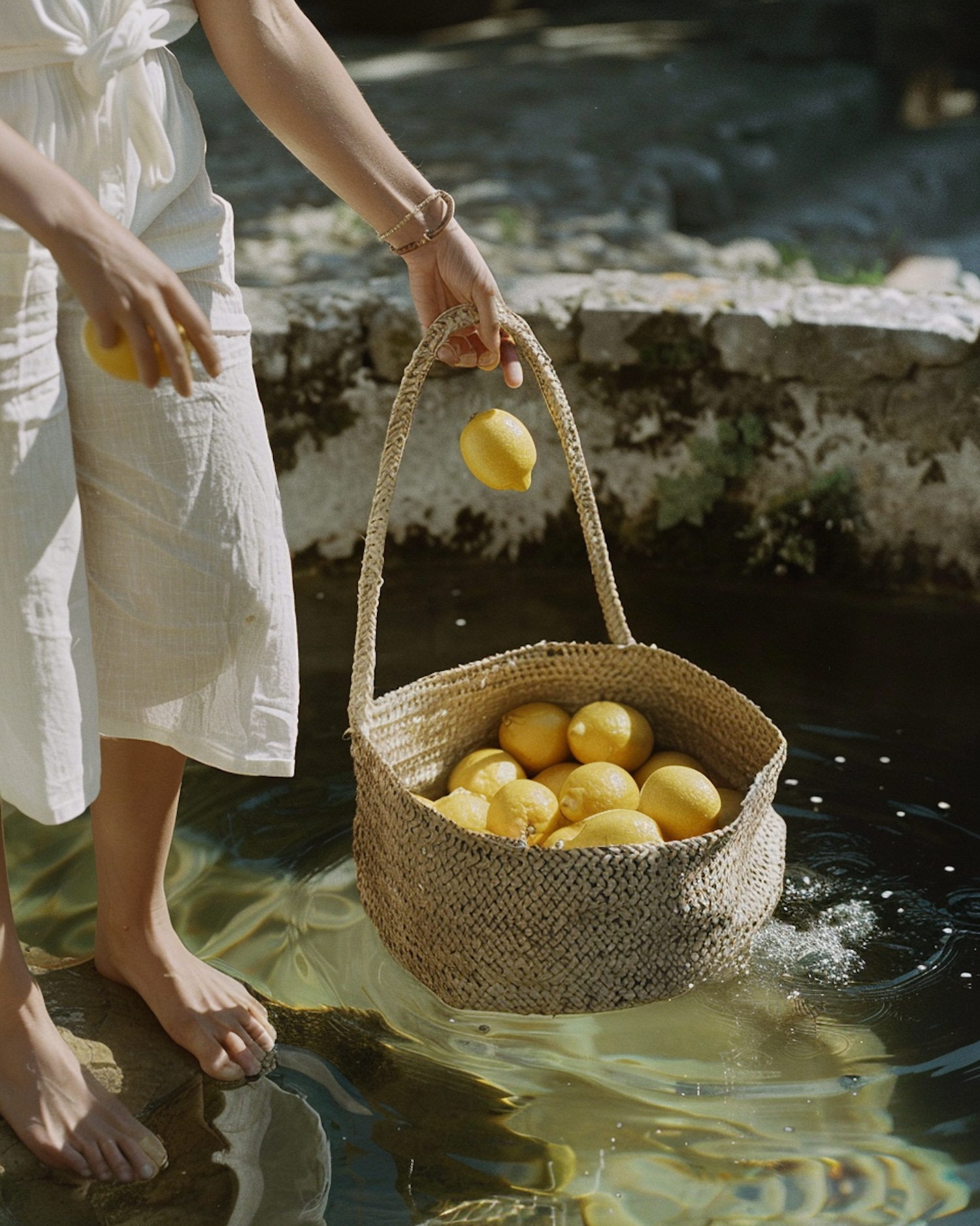 Barefoot person in white dress holds a basket of lemons in clear water, creating a serene and natural scene.