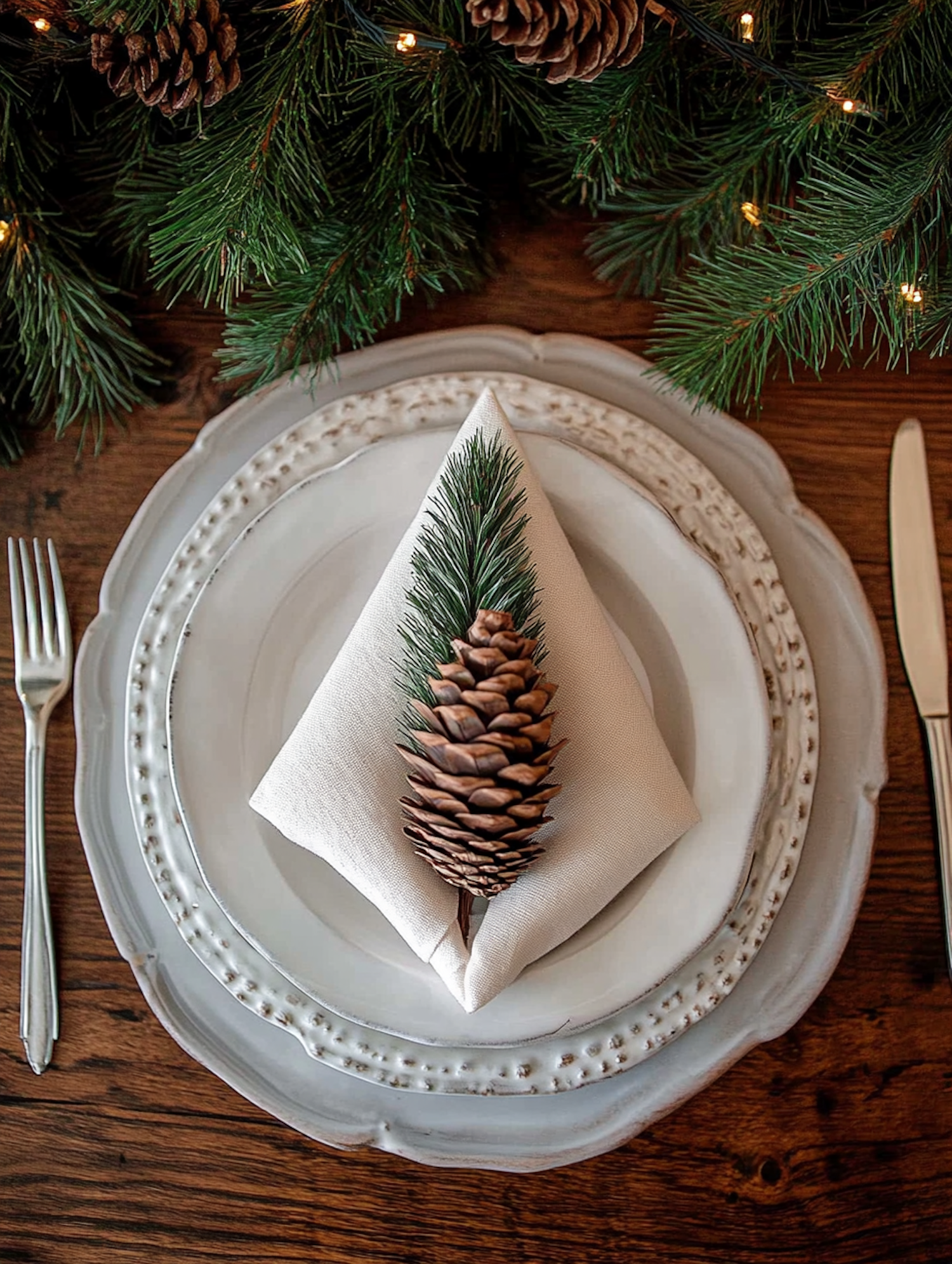 Elegant holiday table setting with pinecone and evergreen napkin on white plates, surrounded by pine branches and warm lights.