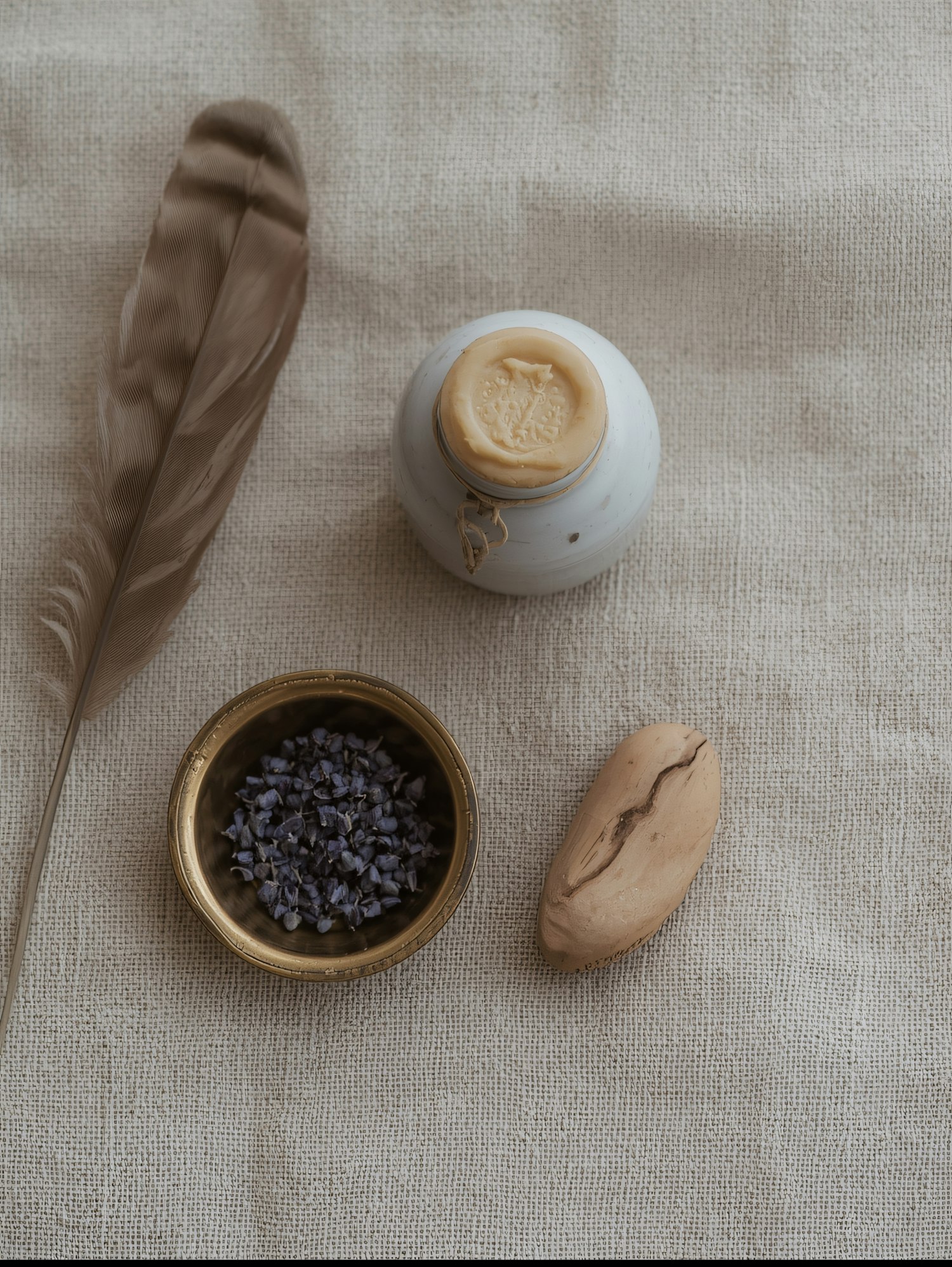 Rustic flat lay with a feather, dried lavender in a brass bowl, a wax-sealed jar, and a cracked stone on textured fabric.