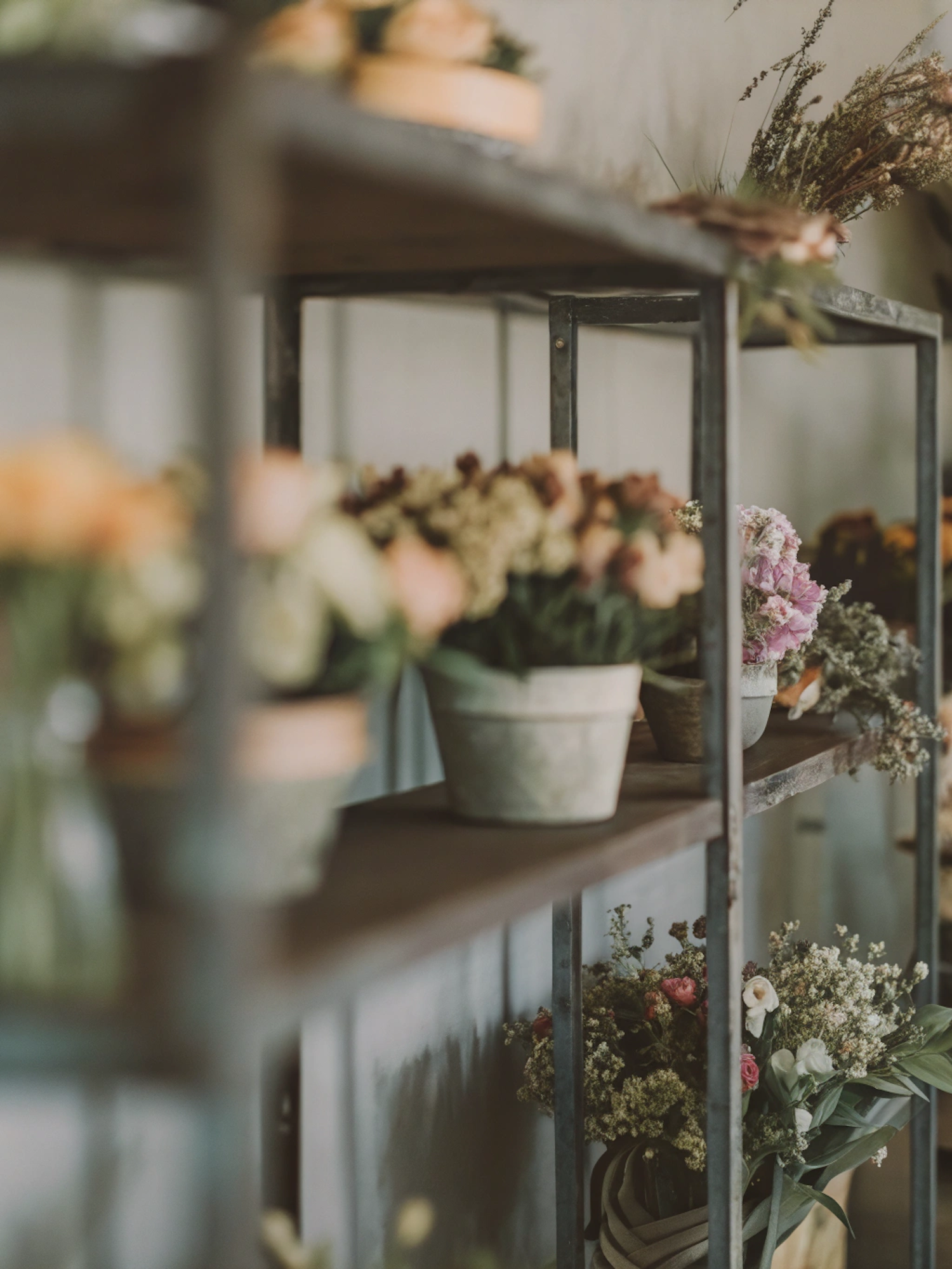 Rustic shelves with potted flowers in soft pink, white, and green tones, creating a cozy and natural indoor floral display.
