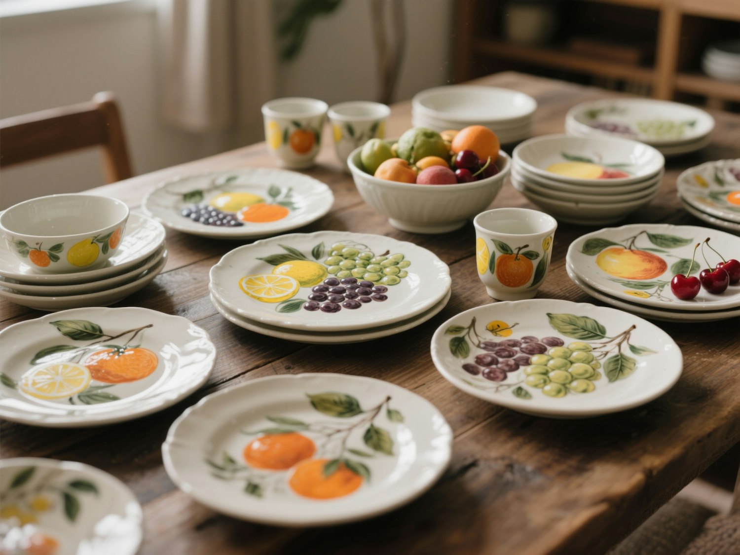 A rustic table set with fruit-themed ceramic plates and bowls, complemented by a bowl of fresh fruits, creating a cozy dining atmosphere.