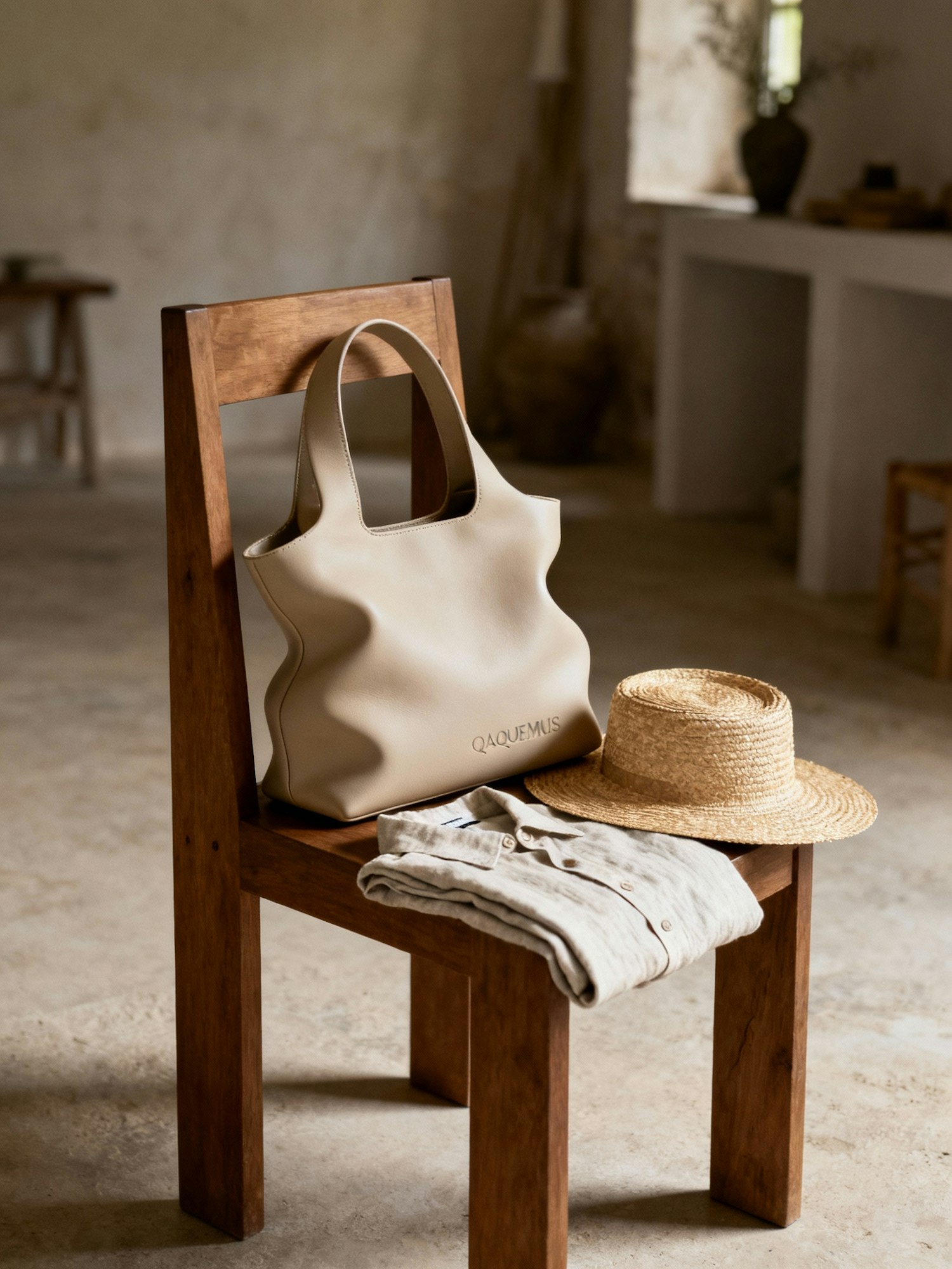 A beige designer bag, straw hat, and linen shirt on a wooden chair in a rustic, minimalist interior with soft lighting.