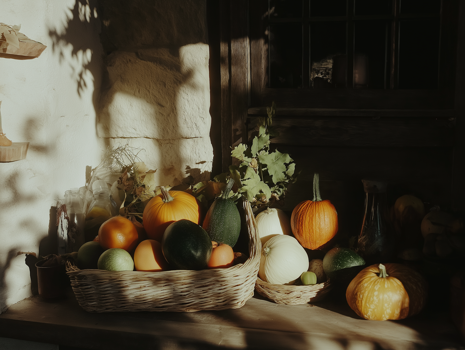 Rustic autumn scene with pumpkins and gourds in wicker baskets, bathed in warm sunlight, creating a cozy harvest atmosphere.
