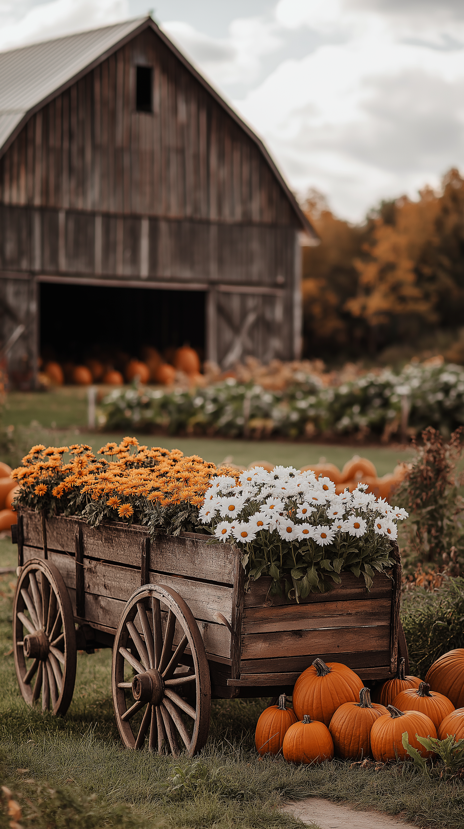 Rustic cart with flowers and pumpkins in front of a barn, capturing a charming autumnal farm scene.