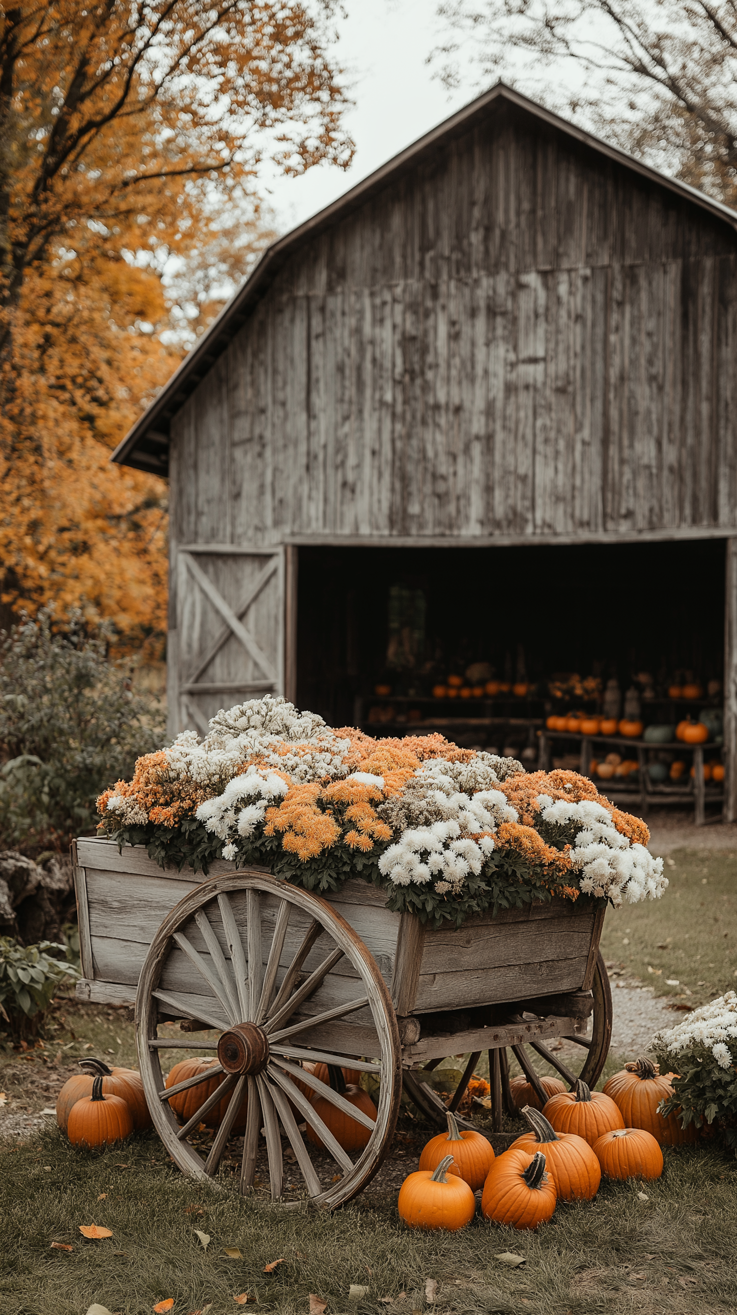 Rustic cart with chrysanthemums and pumpkins in front of a weathered barn, surrounded by autumn foliage.