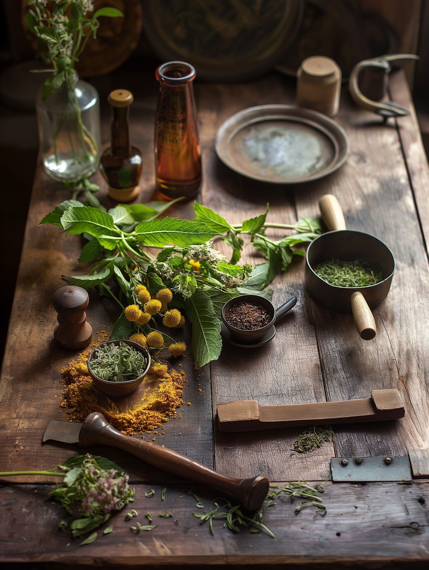 Rustic table with fresh herbs, spices, and vintage tools, evoking traditional herbal medicine or culinary preparation.