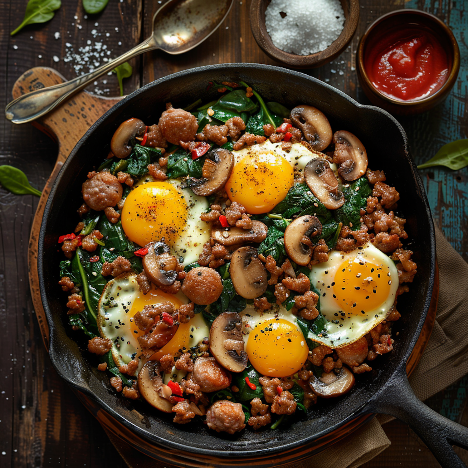 Hearty breakfast skillet with eggs, sausage, mushrooms, and spinach, garnished with chili and pepper. Perfect for a rustic morning meal.