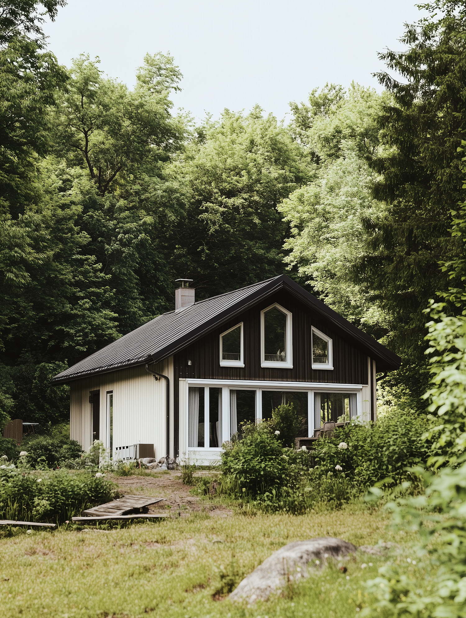 Charming wooden house in a lush forest setting, featuring large windows and a serene, secluded atmosphere.
