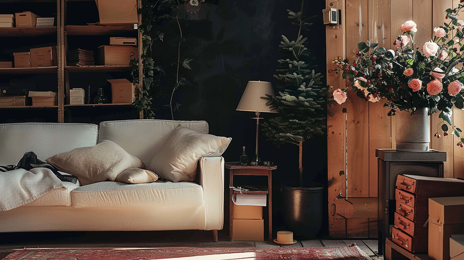 Cozy living room with cream sofa, plush pillows, and vibrant flowers. Warm lighting and organized shelves create a serene atmosphere.