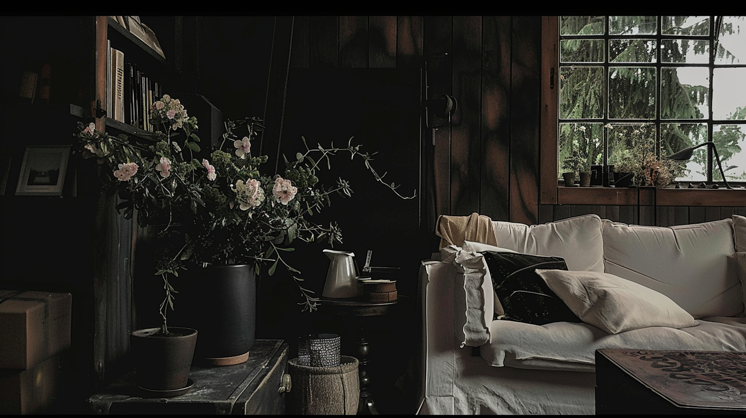 Cozy living room with white sofa, lush plants, and rustic decor. Natural light streams through a large window, creating a warm ambiance.