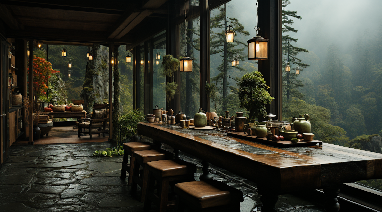 Rustic dining area with wooden table, ceramic pots, and forest view through large windows. Cozy ambiance with warm lighting and natural decor.