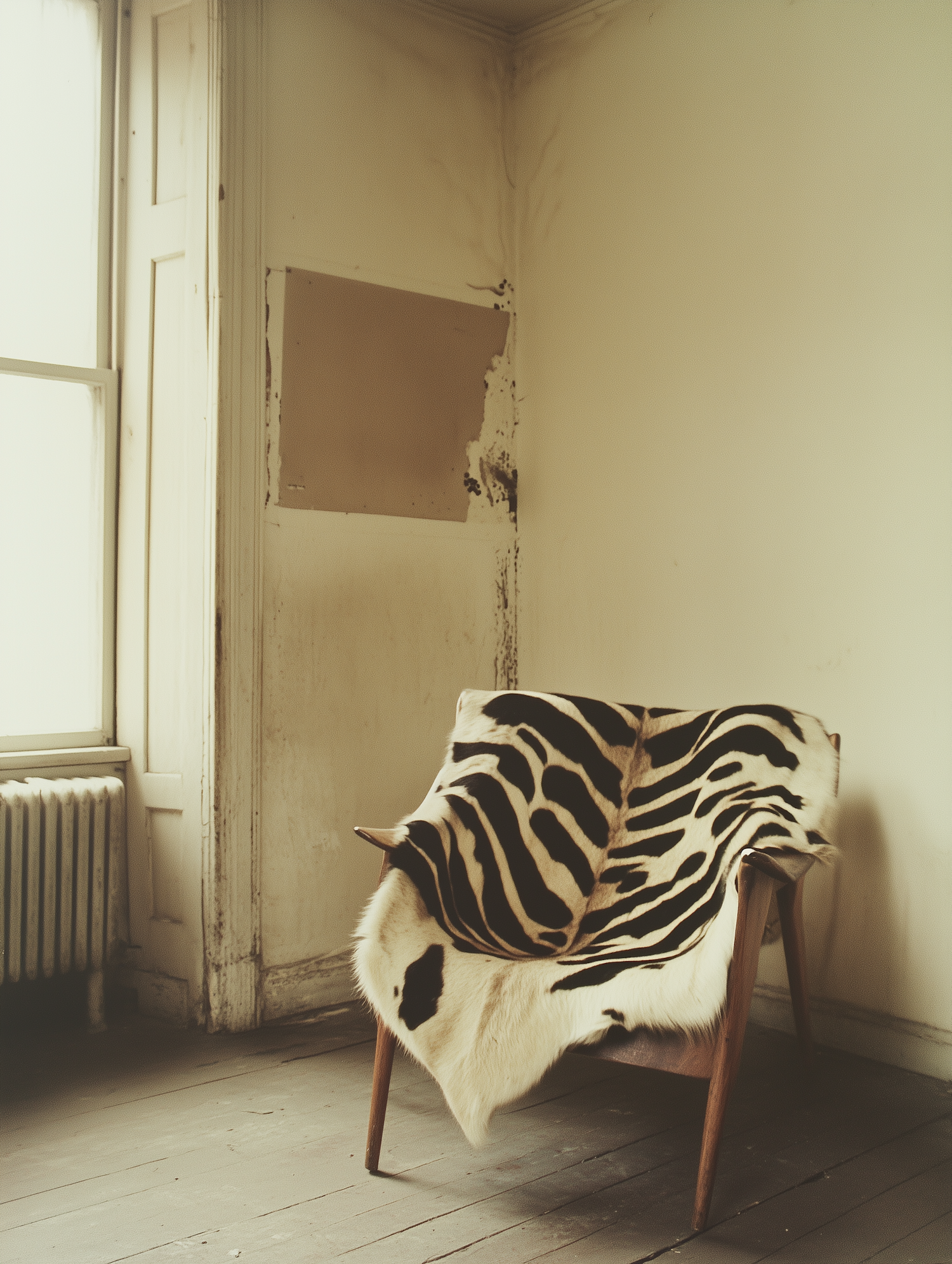Rustic room with a zebra-patterned fur throw on a wooden chair, distressed walls, and natural light streaming through a large window.