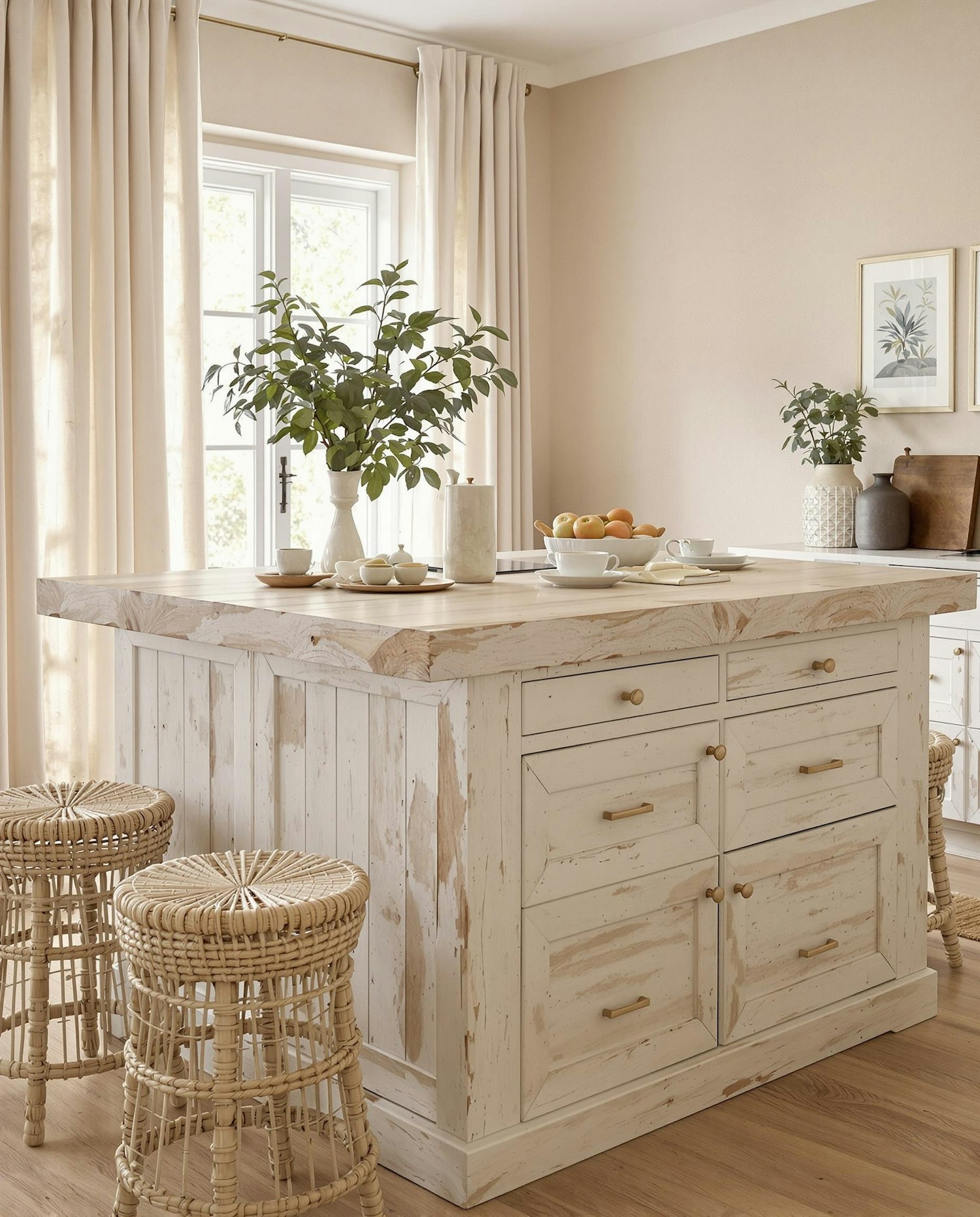 Rustic kitchen with a distressed white island, rattan stools, and natural decor. Bright and cozy with warm beige tones and greenery.