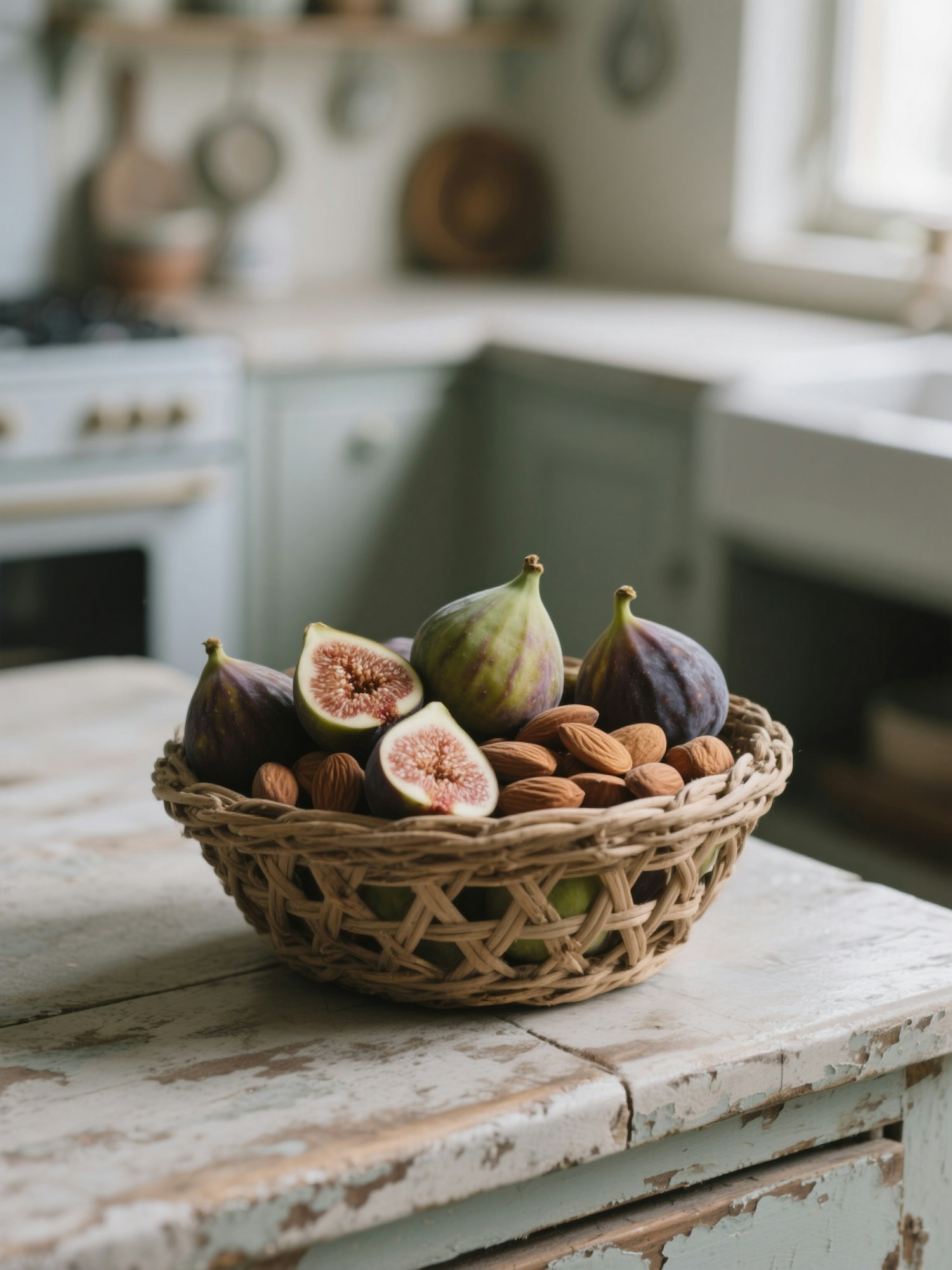 A rustic basket of fresh figs and almonds on a weathered table in a cozy kitchen with soft natural lighting.