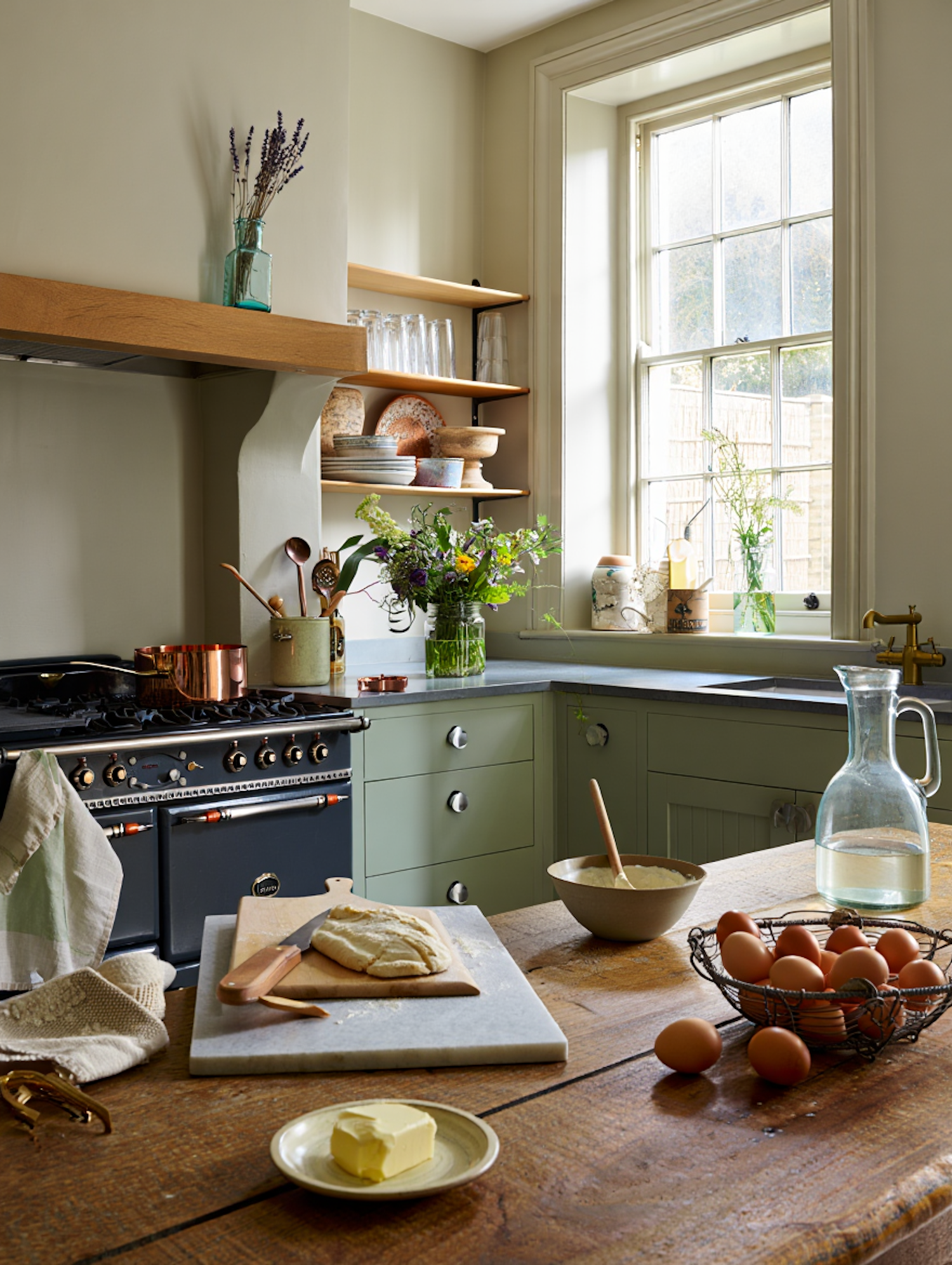 A rustic kitchen with a wooden counter, classic stove, open shelves, and a natural feel, featuring a baking setup with dough, eggs, and butter.