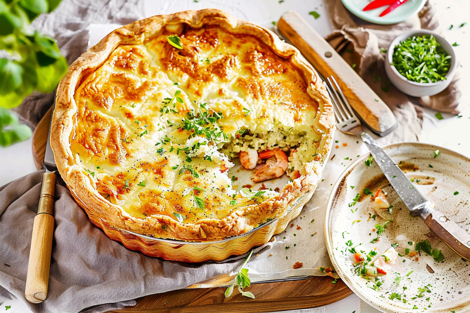 Golden-brown savory pie with shrimp and vegetables, topped with fresh herbs. A slice is removed, revealing the delicious filling.