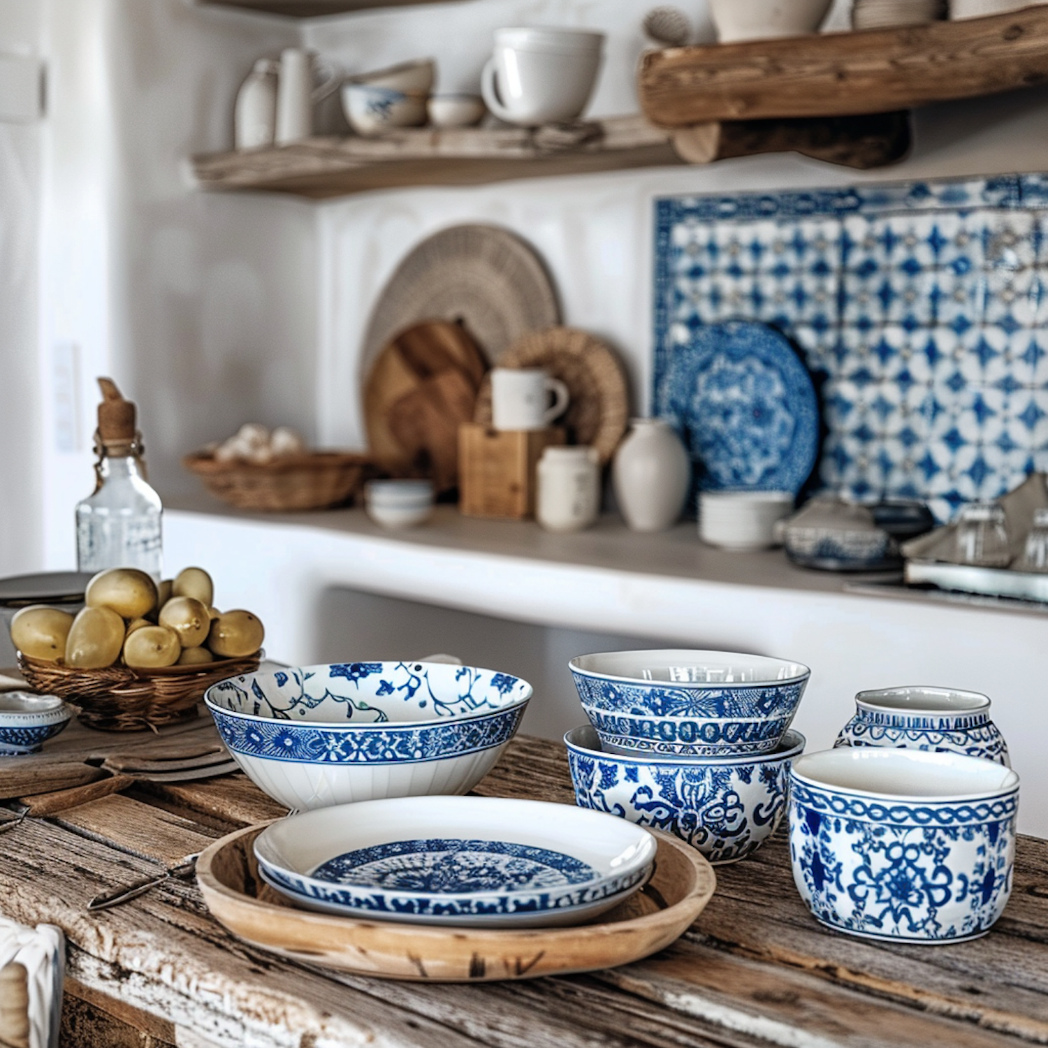 Rustic kitchen with blue and white ceramic dishes, wooden shelves, and a basket of olives, creating a cozy and inviting atmosphere.
