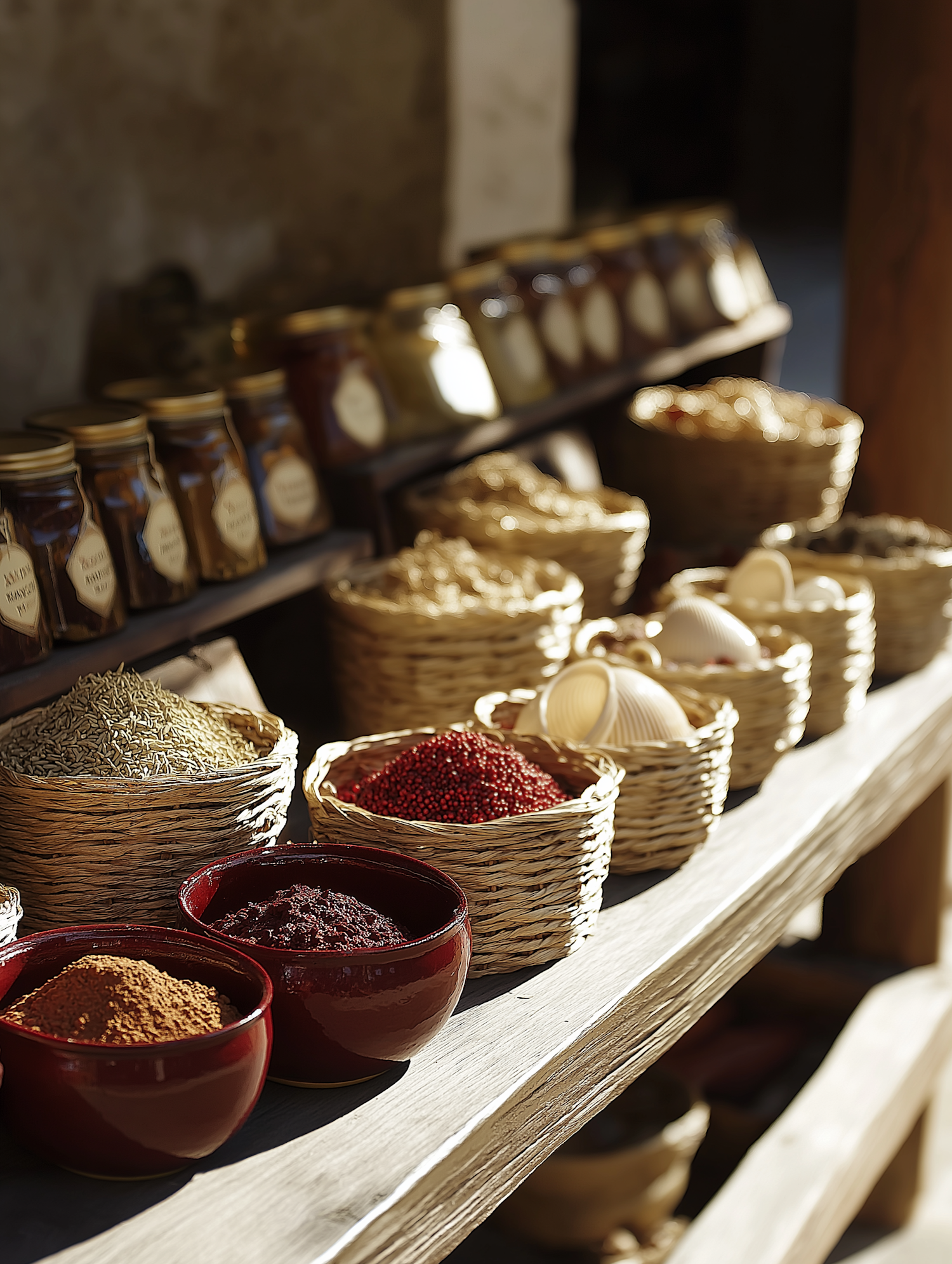 Rustic market stall with spices, grains in baskets, and jars of honey on wooden shelves, bathed in warm sunlight.
