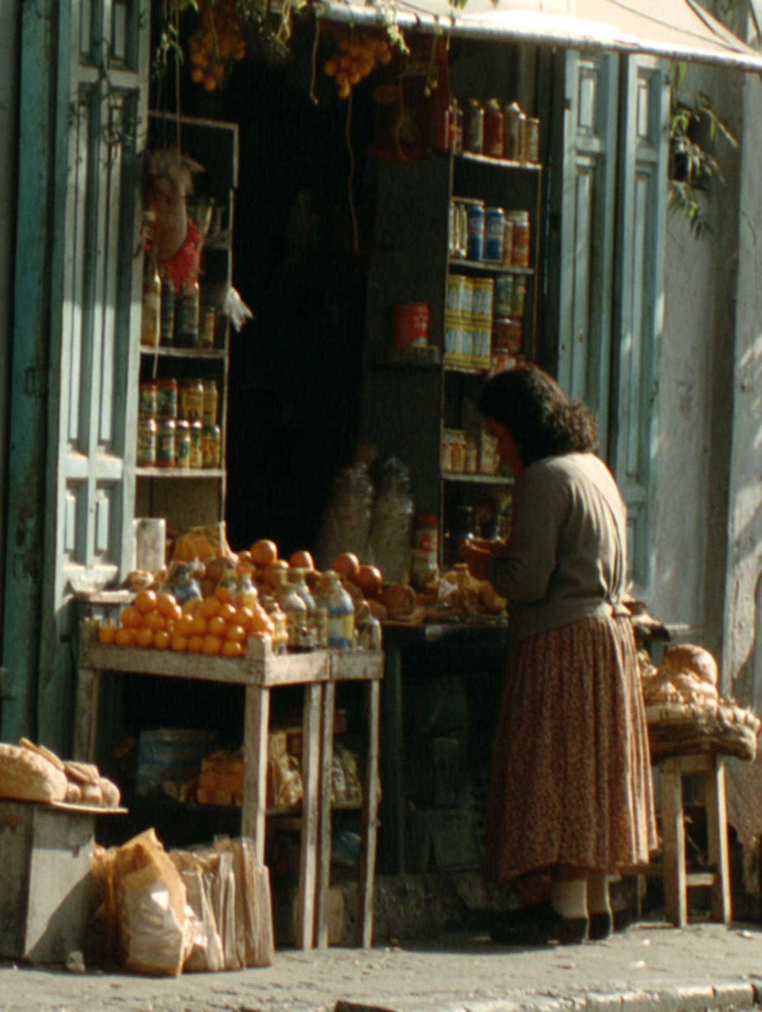 A rustic market stall with fresh produce, jars, and bread, as a woman shops in a cozy, traditional setting with blue doors.