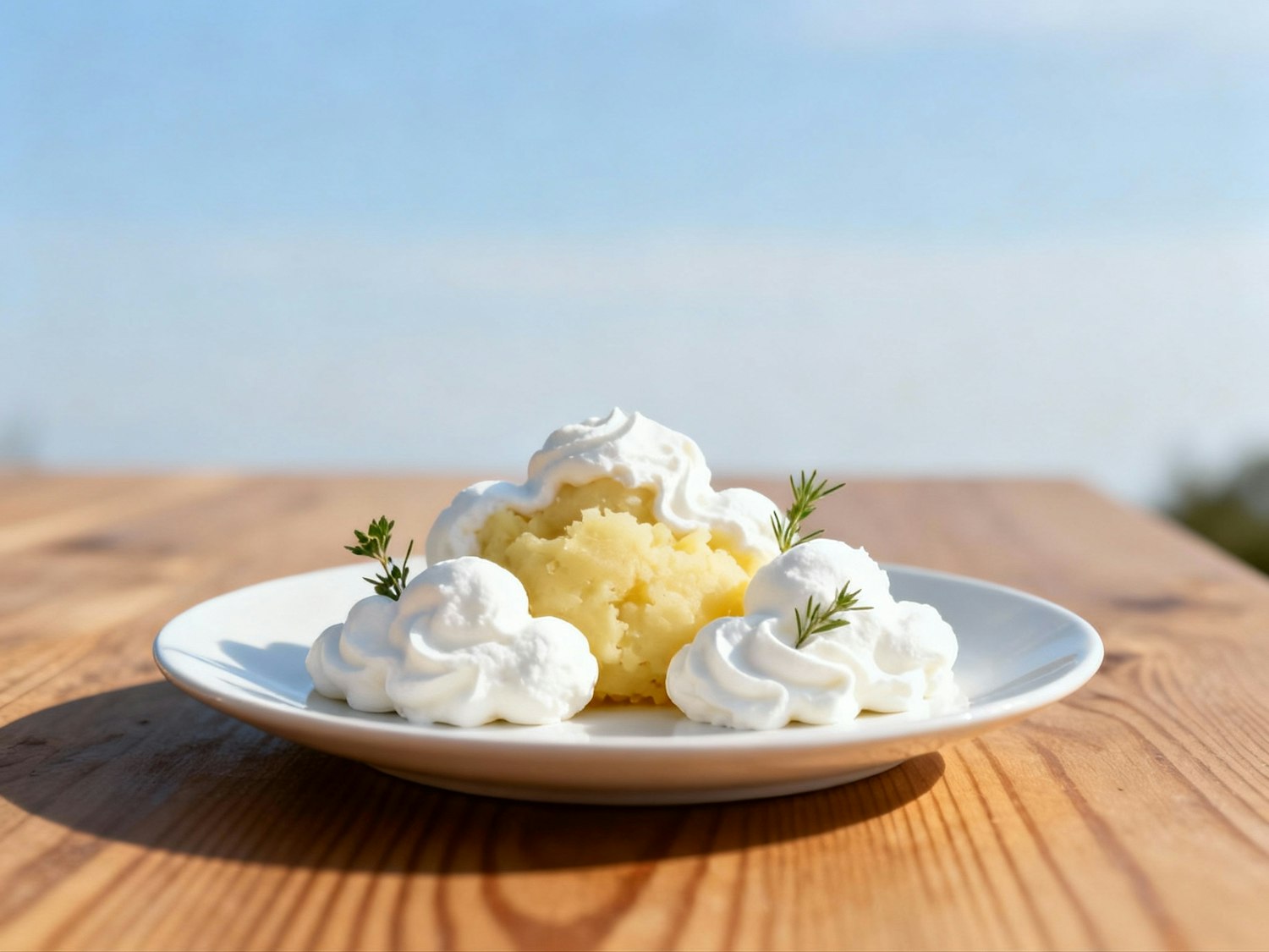 A plate of mashed potatoes with whipped cream and herbs on a wooden table, set against a clear blue sky in an outdoor setting.