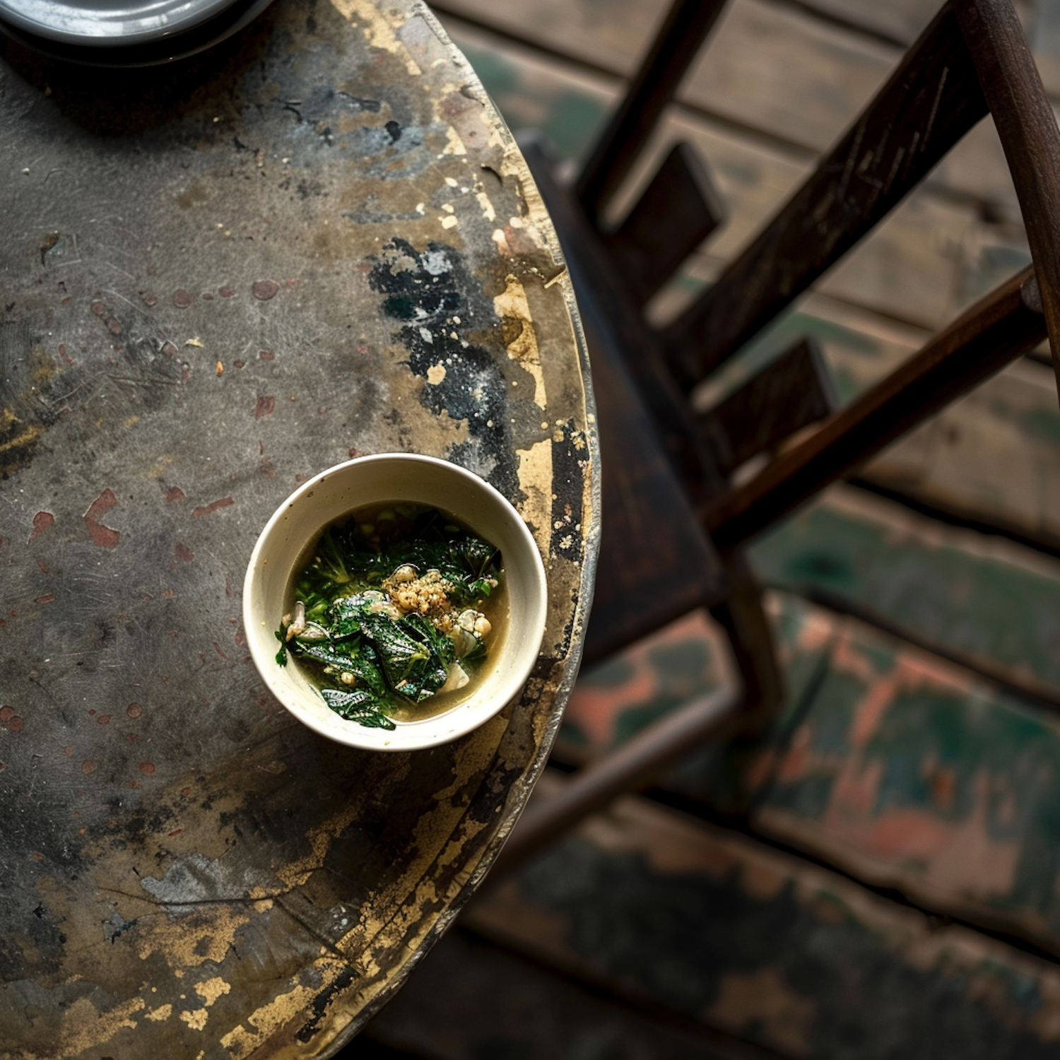 Rustic table with peeling paint holds a bowl of green leafy soup, creating a vintage, homely atmosphere with a wooden chair nearby.