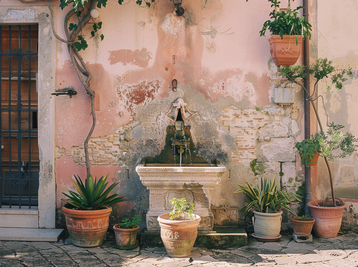 Rustic stone fountain against a weathered pink wall, surrounded by potted plants and climbing vines, creating a serene, timeless scene.