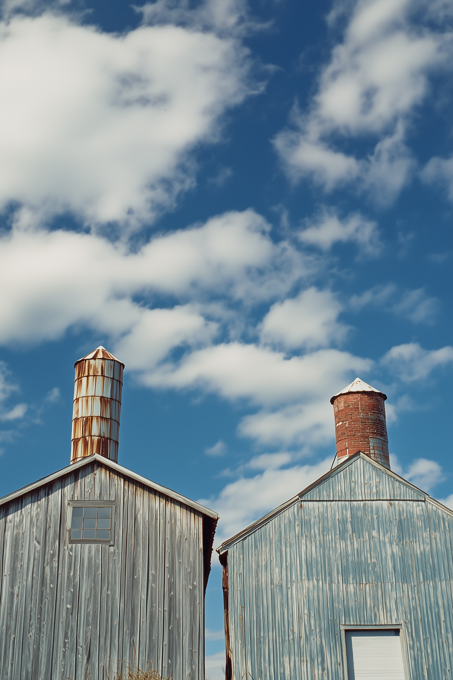 Two rustic metal buildings with distinct chimneys under a bright blue sky with fluffy clouds, showcasing industrial charm.