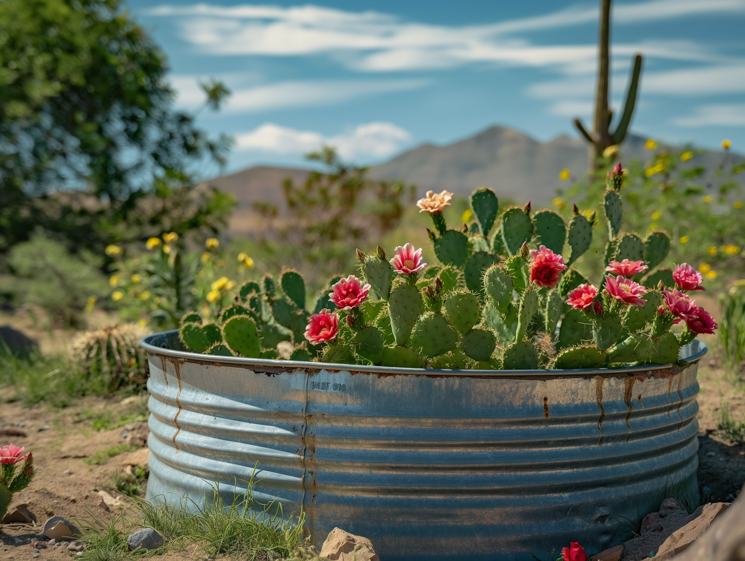 Colorful desert scene with blooming prickly pear cacti in a metal container, surrounded by wildflowers and a saguaro cactus.