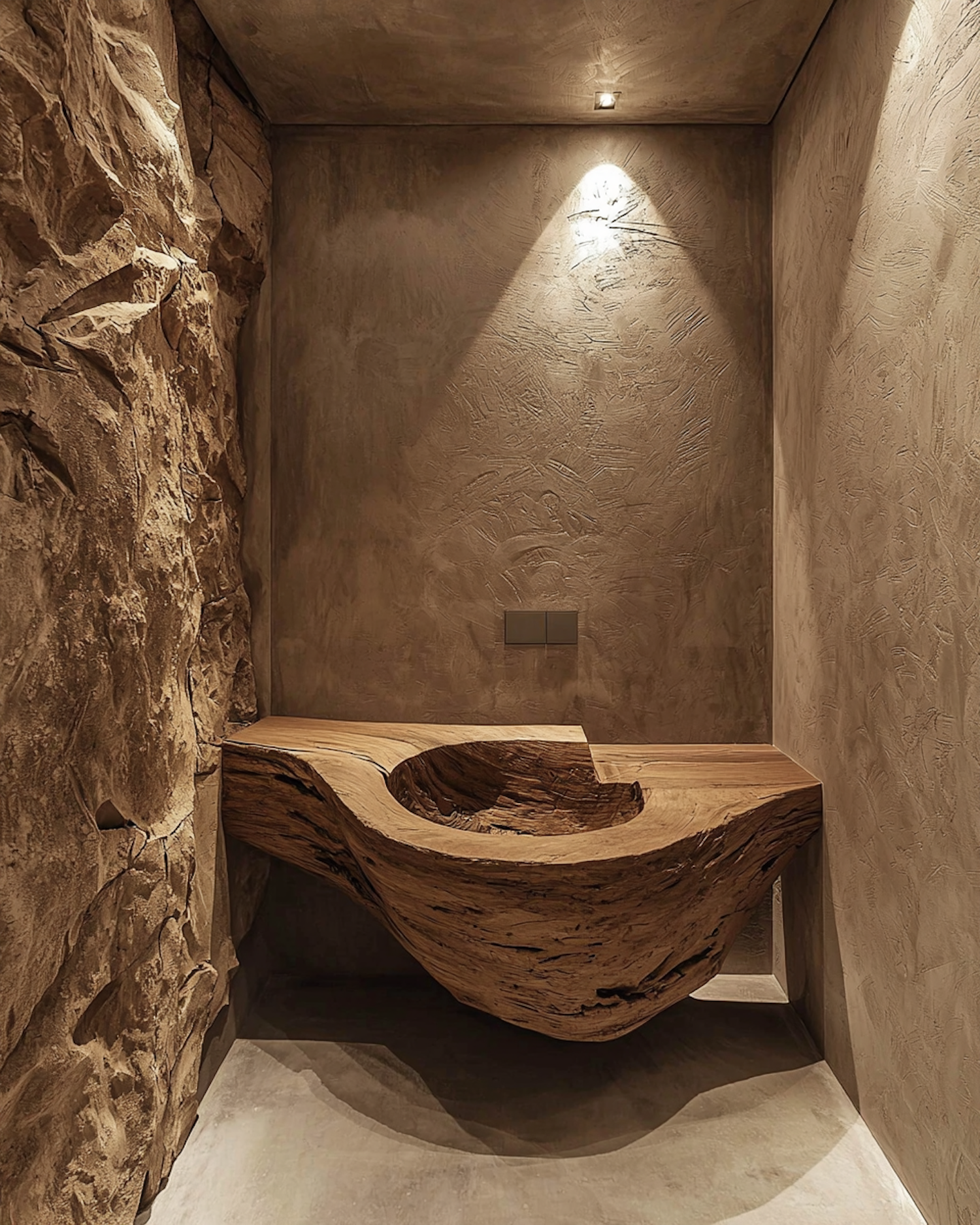 Rustic bathroom with a carved wooden sink, textured concrete walls, and natural rock accents, lit by a warm recessed spotlight.