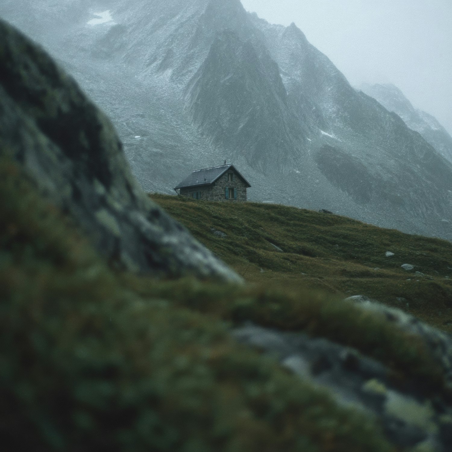 A cozy stone cabin nestled on a misty hillside, surrounded by dramatic, rugged mountains and lush greenery. Perfect for solitude seekers.