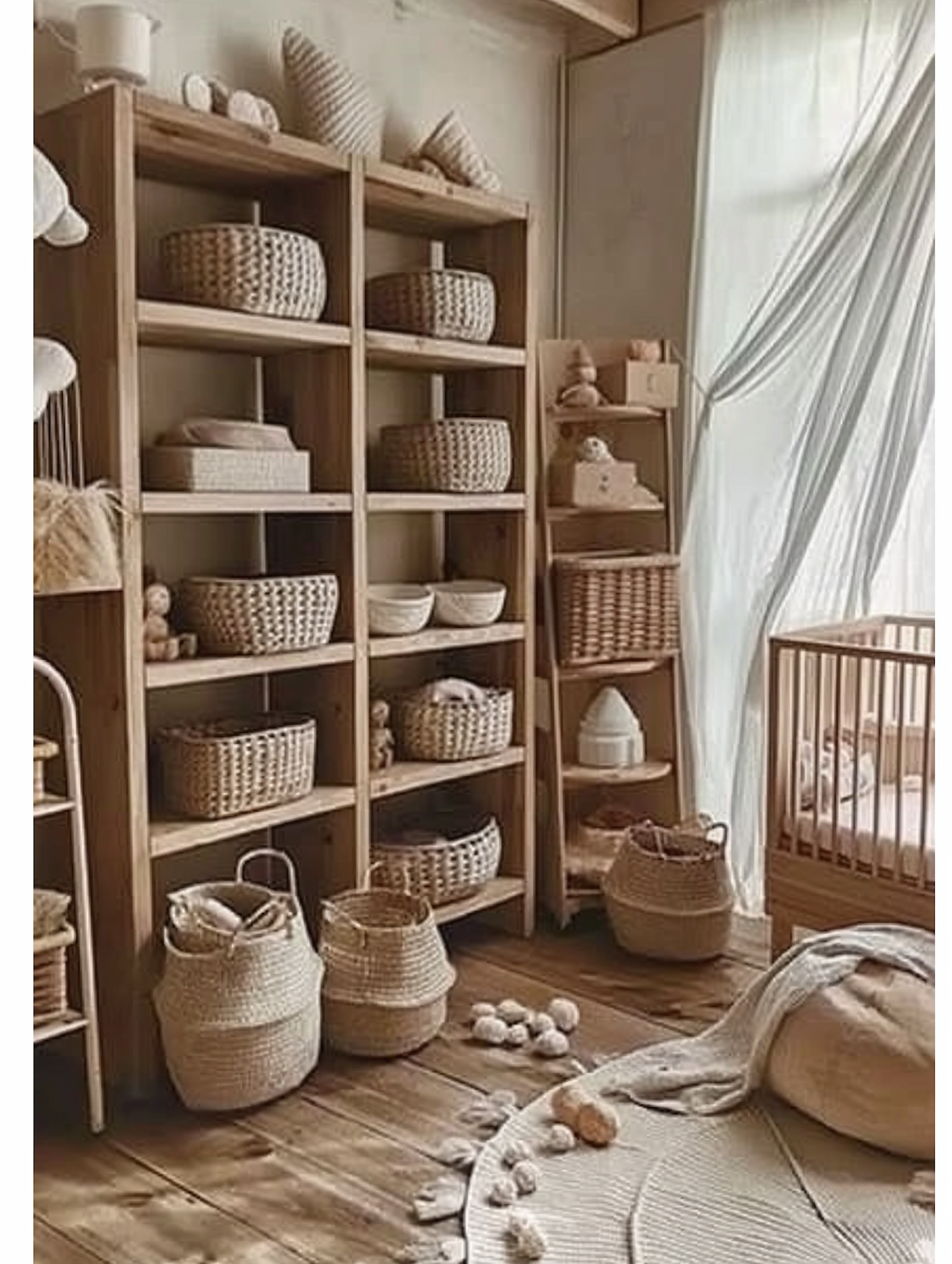 Cozy nursery with wooden shelves, woven baskets, and a soft rug. Natural light filters through sheer curtains, creating a serene atmosphere.