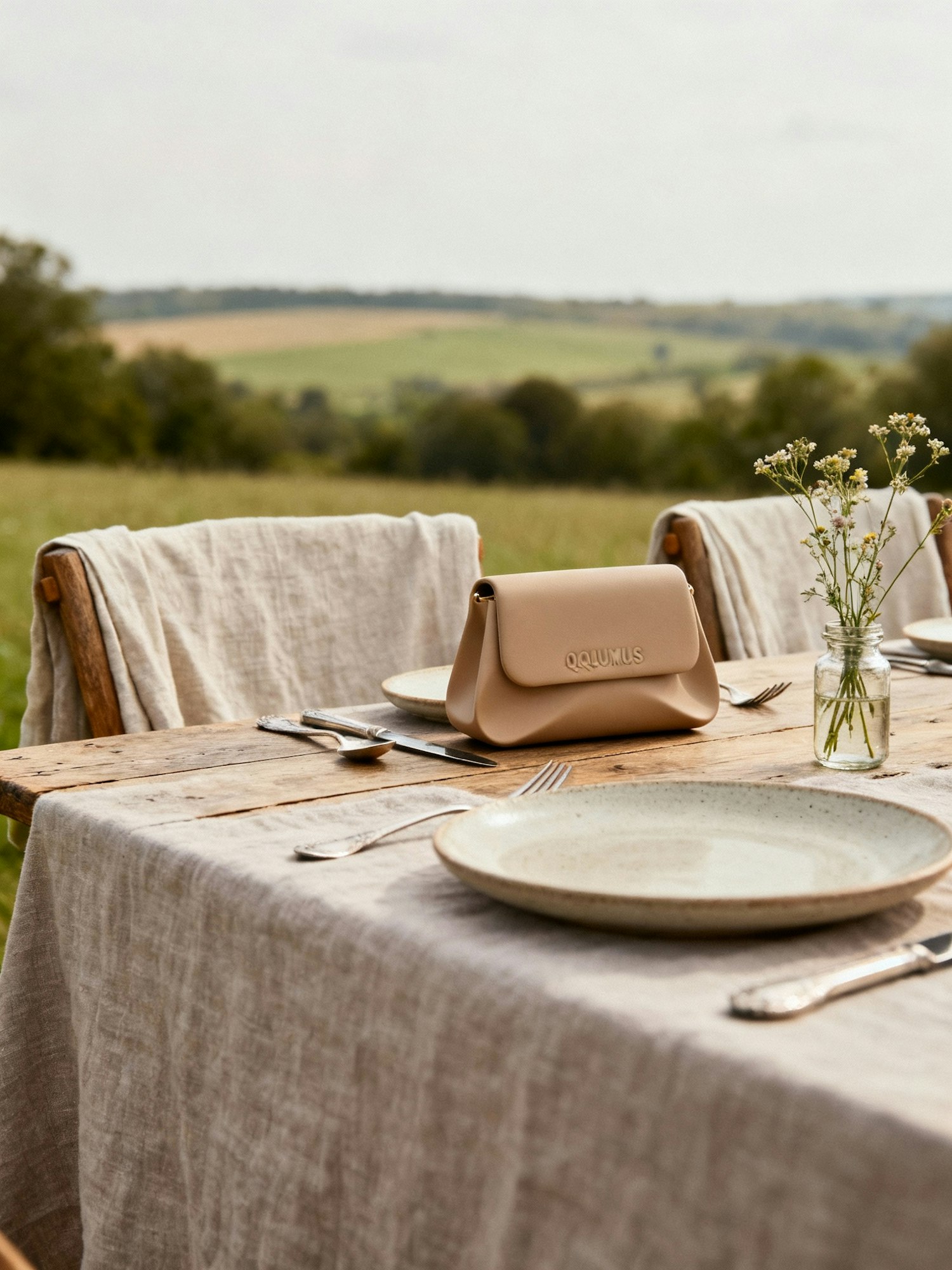 Rustic outdoor dining setup with a beige handbag, ceramic plates, and wildflowers, set against a serene countryside backdrop.