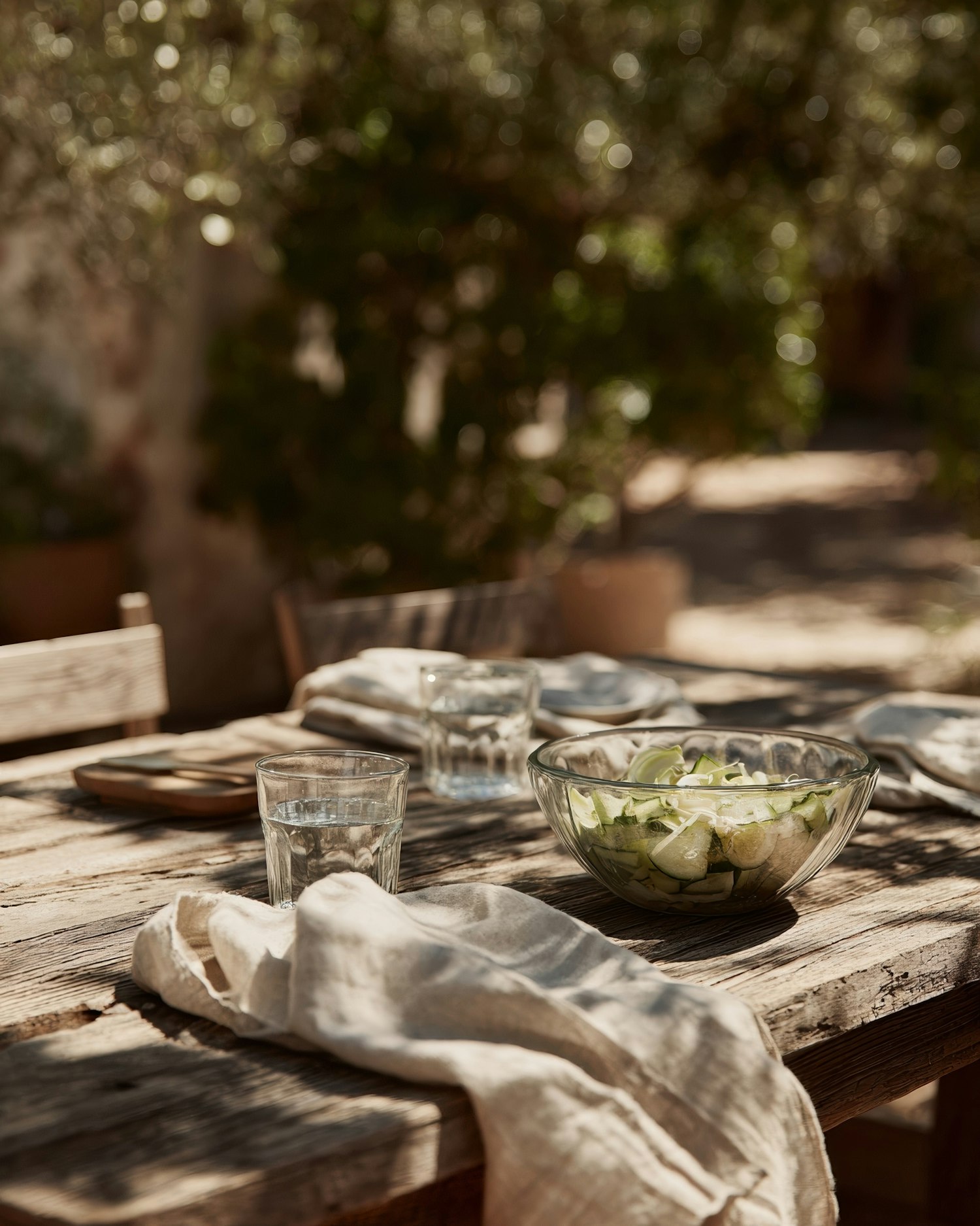 Rustic outdoor table with a fresh salad, water glasses, and cloth napkins, set against a sunny, green garden backdrop.