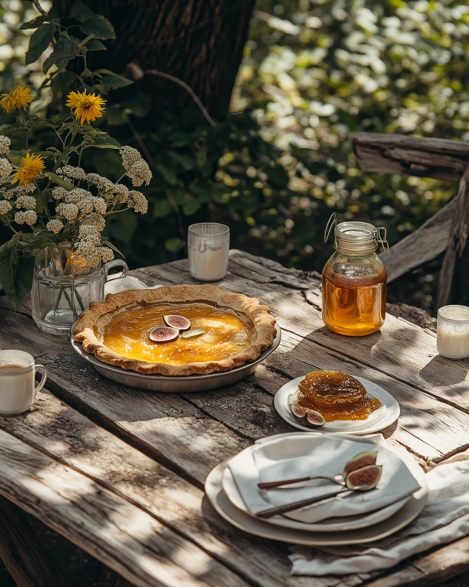 Rustic outdoor table with a fig-topped pie, honey jar, and flowers, creating a cozy, inviting atmosphere.