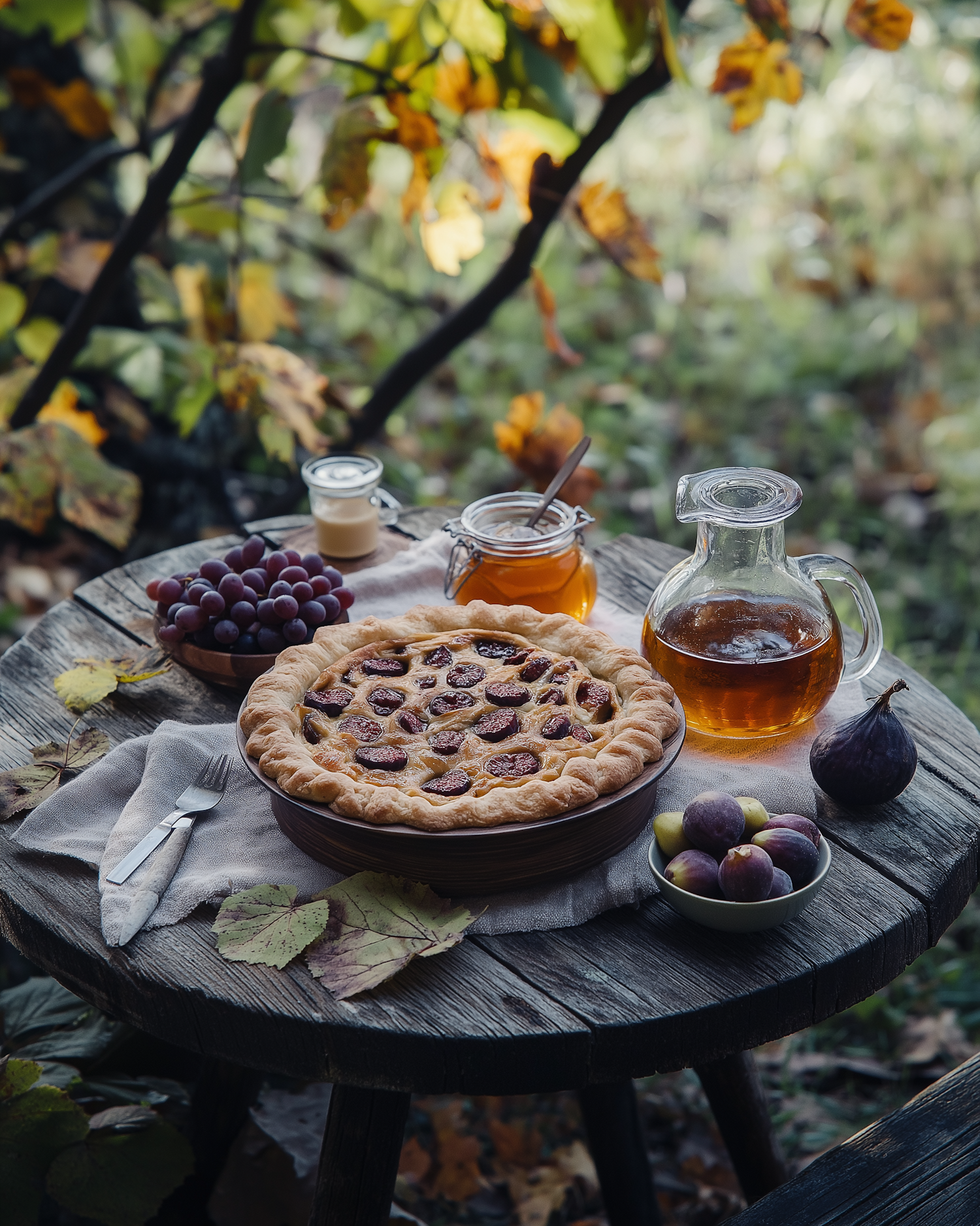Rustic table with a fruit pie, grapes, figs, and a pitcher of cider in a serene autumn garden setting.