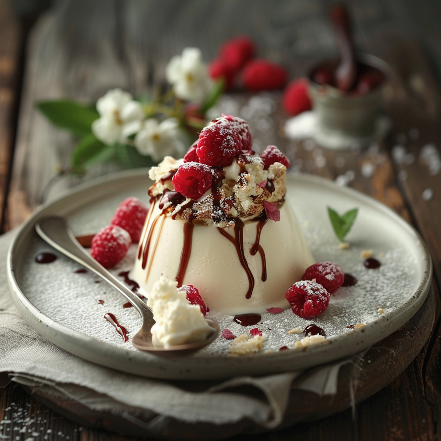 Elegant panna cotta with chocolate drizzle, fresh raspberries, and crumbled nuts on a rustic plate, perfect for a gourmet dessert.