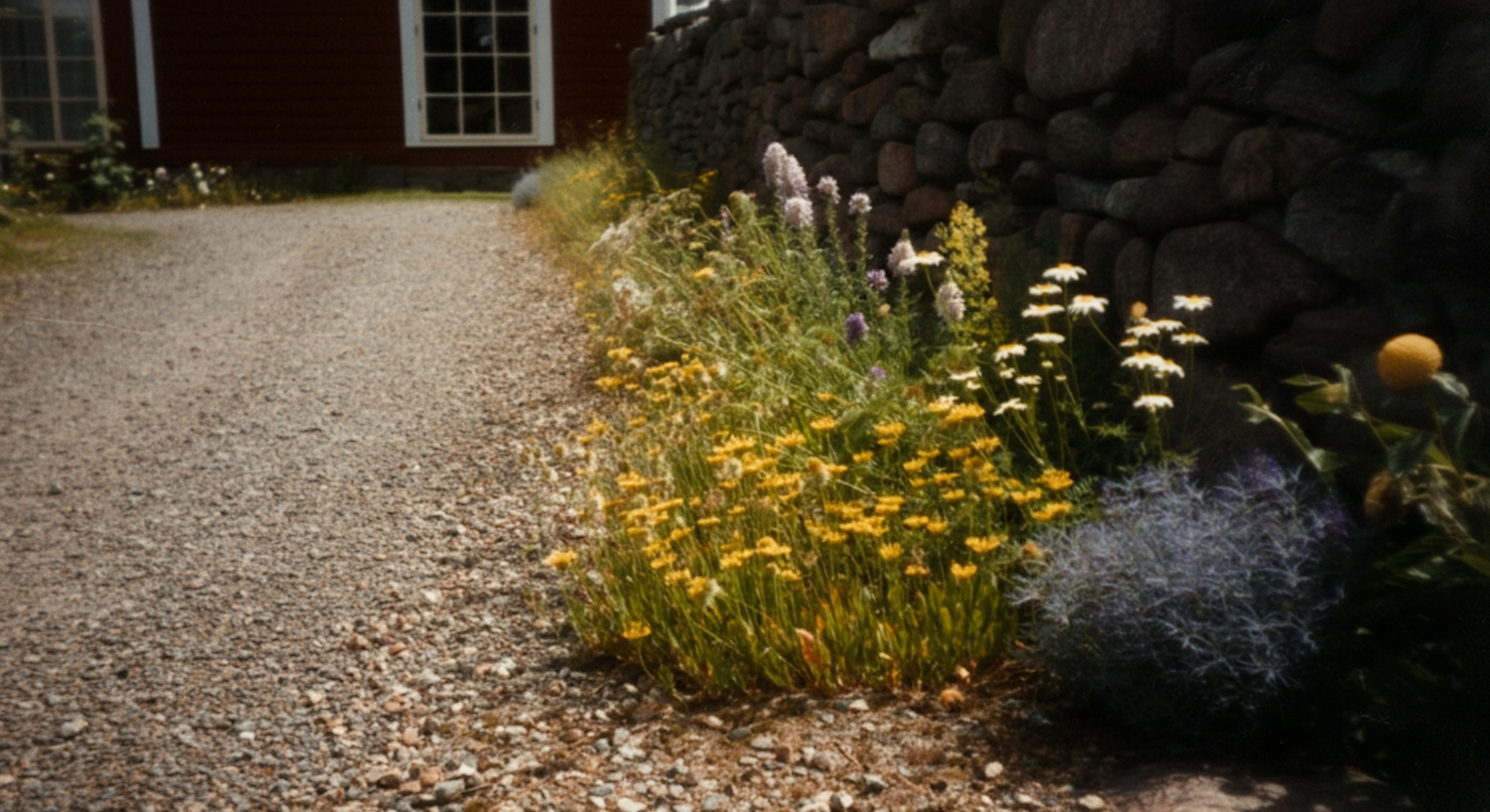 Charming gravel path lined with colorful wildflowers, a rustic stone wall, and a red wooden building in the background.