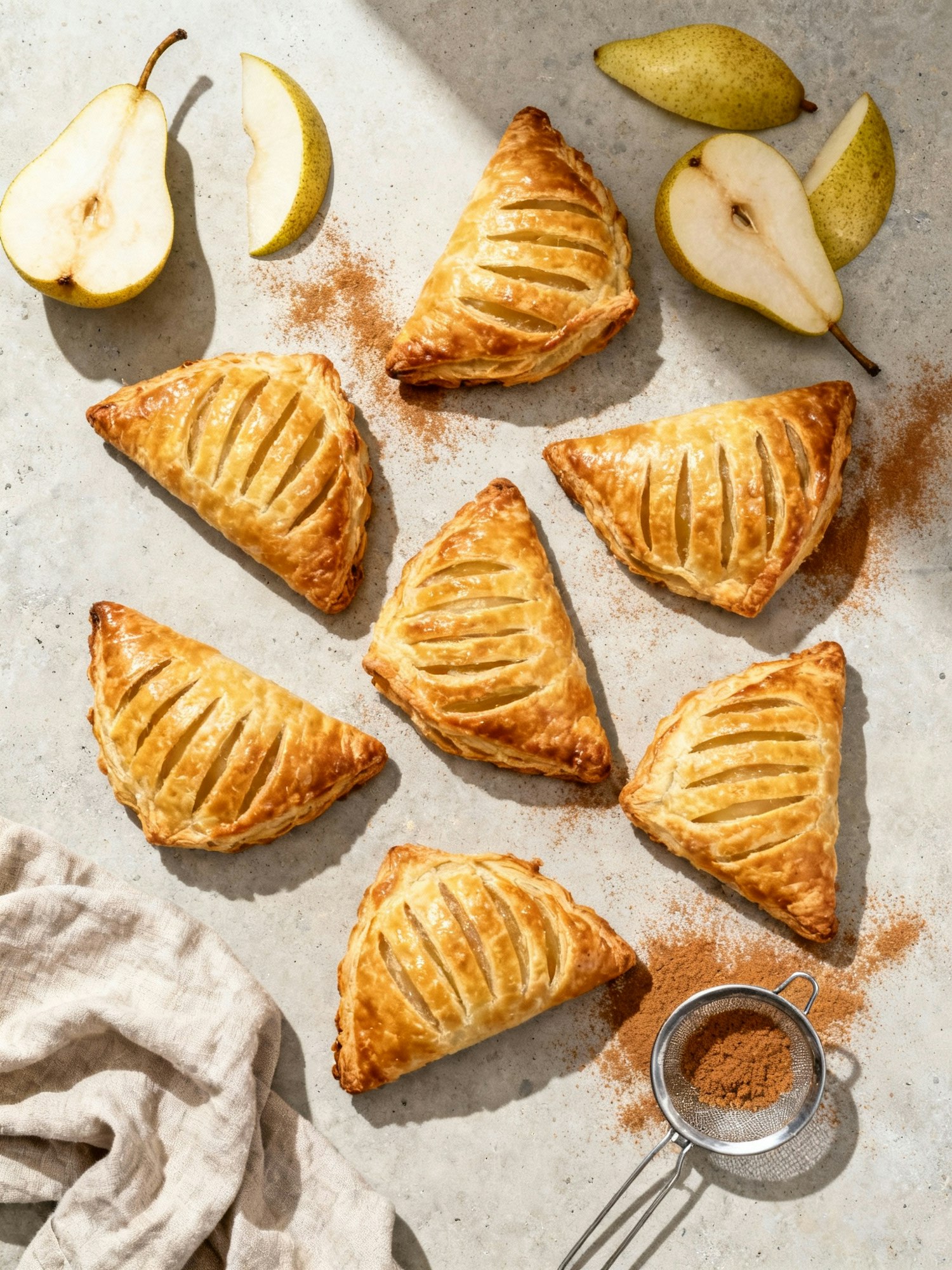 Ultra-real overhead flat lay of golden pear turnovers with visible laminated layers, pear slices, cinnamon sugar dust, and a small sieve with residual sugar; linen napkin softly wrinkled. Medium-format (150MP); 55–65 mm at f/8; big soft overhead 5600 K through 6×6′ diffusion, perimeter flags; ISO 100. Angle: true 90°. Surface: pale concrete. Color: clean neutrals, warm golds. Negative: perfect grid symmetry, fake steam, excessive contrast, color cast, logos, watermarks.