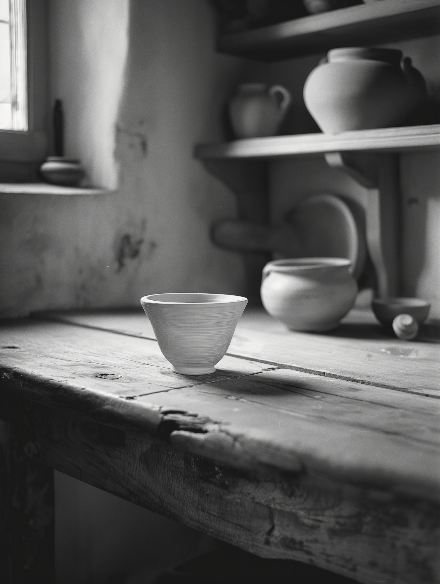 Monochrome image of a pottery cup on a rustic wooden table with blurred pottery in the background, evoking simplicity and craftsmanship.