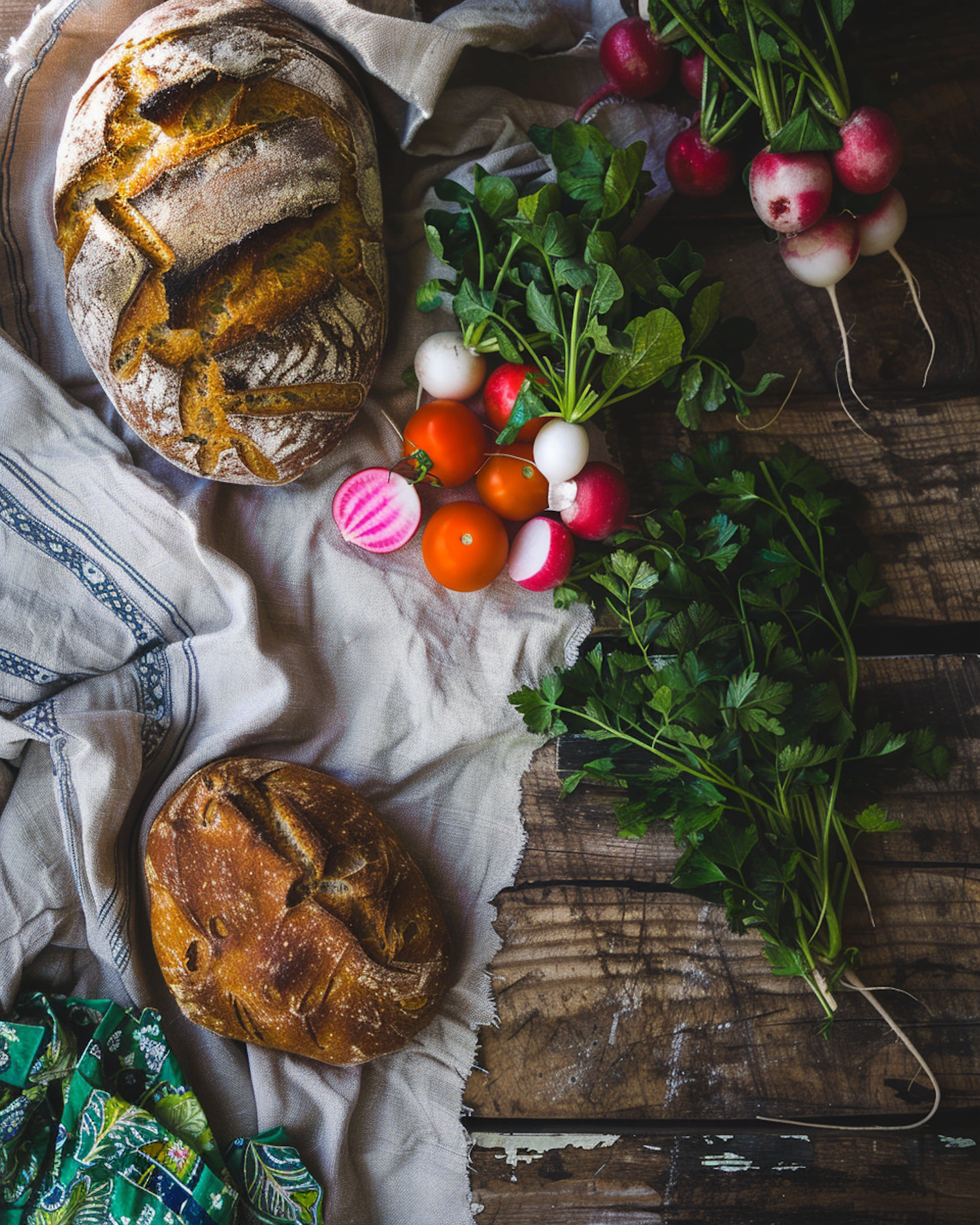 Rustic artisan bread with fresh radishes, tomatoes, and beets on a wooden table, showcasing a farm-to-table aesthetic.
