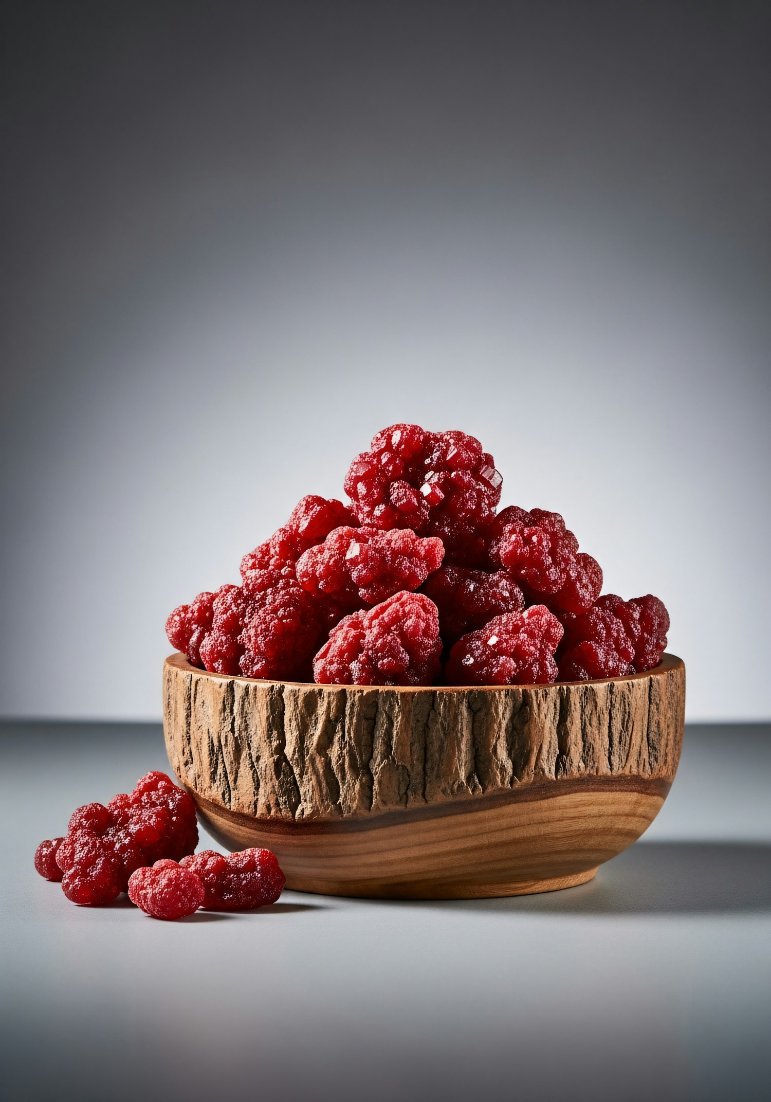 A rustic wooden bowl filled with frosted red raspberries on a smooth gray surface, with a clean gradient background.